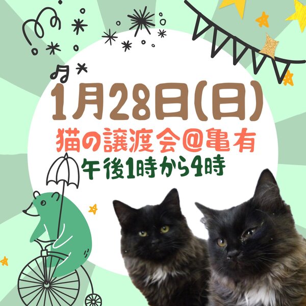 | イベント内容 | 外で生まれた子、遺棄された子、外で暮らしている猫達が皆あたたかな手を必要としています。 そんな猫達を保護して家庭の中で育てています。 その子の個性を良く理解し確実なご縁を繋ぐ為、多くの猫達を保護する事は出来ませんが大切な出会いを探しています。 お迎えする方の環境や生活スタイルに適した猫さんをご紹介できますので、どういう猫がいいのかと迷っている方へのご相談も受けています。 どうそお気軽にいらしてみて下さい。 ◆参加猫さんたちは皆ケージの中を暖かくしておりますので、寒さは大丈夫です。 |