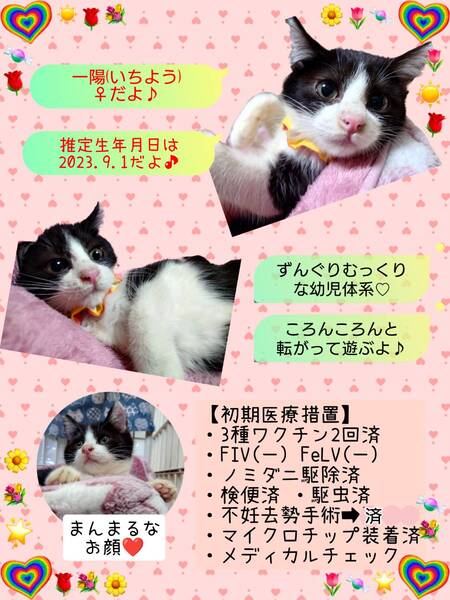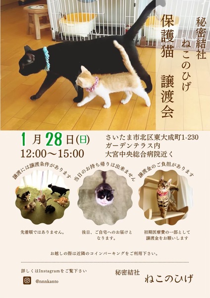 | イベント内容 | 【秘密結社ねこのひげ♡保護猫譲渡会】 1/28(日) 12:00~15:00 さいたま市北区東大成町1-230 金子建材内 ガーデンテラスにて 保護猫譲渡会を開催します☆ 昨年夏~秋生まれの仔猫幼猫祭継続中! まだまだ子猫だにゃー!なヤング猫や 小童には負けへんでー!なオトナ猫も♪ 合計10数頭が参加予定です♪ 未来のご家族さまと 愛し愛されな 両想いになれますように♡ 家族にするなら保護猫だべ♪♪ こんなご時世だけど 新しい家族と笑顔で暮らしたい♪ という方は是非会いにいらしてください♡ ご不明な点がございましたら インスタグラム @秘密結社ねこのひげ の DMまでお問い合わせ下さい☆ |