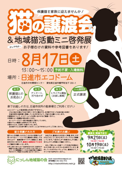 | イベント内容 | 8月17日(土)に「猫の譲渡会」を開催いたします。 猫少なめのミニ譲渡会&地域猫活動啓発展です。 日進市内で保護された猫さんたちがお待ちしております。 まだ猫を飼う予定のない方も、また、地域猫活動に興味のある方、猫でお困りの方もどうぞお気軽にお立ち寄りください!(^^)/ 【日時】2019年8月17日(土)13:00〜15:00 【会場】日進市エコドーム(中央環境センター) ※ご予約不要・入場無料です。 ※猫ちゃんの譲渡には条件がございます。詳細はホームページをご参照ください。 ※車でお越しの方は、日進市役所の駐車場をご利用ください(徒歩1分)。 ※エコドームの駐車場は、ごみを持参される方専用のため、利用できません。ごみの処分を兼ねてお立ち寄りくださる場合でも、誠にお手数ですが、ごみ処分後にお車を日進市役所の駐車場へ移動していただきますよう、どうぞご協力をお願いいたします。 【主催】にっしん地域猫の会 【ホームページ】http://nissinchiikineko.main.jp |