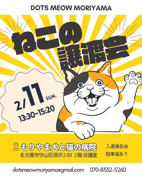 | イベント内容 | 2/11(日)ねこの譲渡会を開催します! 日時:2024年2月11日(日) 13:30〜15:20 場所:動物医療センター もりやま犬と猫の病院 2階会議室 (名古屋市守山区深沢2-101) ▶ 入退場自由 | 駐車場あり ▶ 参加する保護ねこたちの愉快な暮らしは、 インスタグラムでほぼ毎日公開しています! 【公式アカウントはこちら】 @dotsmeowmoriyama https://www.instagram.com/dotsmeowmoriyama 個性爆誕な保護ねこたちに、ぜひ会いに来てくださいね! -------------------------------------- \「保護ねこを応援したい!」皆さまへ / ねこちゃんを迎えてあげられなくても、 いろんな方法で応援することができます。 ◤ ①オリジナルグッズの販売をしています! プロフィールにある「ショップ」から飛べます。 DOTS STUDIO MORIYAMAでは、 オリジナルグッズの対面販売もしていますので、 お買い求めだけのご来場もオッケーです。 ◤ ②保護ねこに「ギフト」が贈れます! ︎︎amazon保護犬・保護猫支援プログラムに参加しています。プロフィール欄にあるURLをみてね。 ◤ ③「フォロー」や「いいね!」で応援できます! 一人ひとりのフォローや、 一つひとつの「いいね!」や「保存」が、 私たちにとって大きな応援になっています。 皆さまの小さくて大きなアクションが、 ずっとのおうちとの出会いにつながっていくかも! -------------------------------------- 【お知らせ】 「のらねこのにゃんでも相談会」のご予約も、随時受け付けています。 にゃんでも相談会は、事前予約が必要です。 詳細は、インスタグラムをご覧ください。 -------------------------------------- ▶ DOTS MEOW MORIYAMAによる野良猫に関する相談支援事業「#のらねこのにゃんでも相談会 」は、名古屋市社会福祉協議会の地域の支え手応援事業「地域の困りごと解決応援助成事業」(名古屋市福祉基金財源)により、助成を受けて実施しています。 |