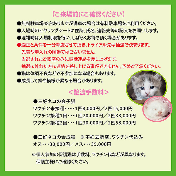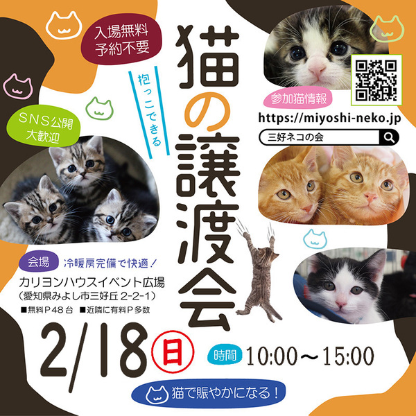 | イベント内容 | 子猫が少ない時期ですので中猫成猫になります。 成猫は性格が落ち着いておりとても飼いやすいです。すぐに懐きます。 相棒猫、猫友、猫の新しいパートナーをお探しのご家族様、ぜひ会いに来てください。 ※一部の子猫中猫成猫は当日撮影のため掲載していません。 当日会場でご確認ください。 (=^・^=)ねこねこ譲渡会(=^・^=) 2月18日(日)/10時~15時 三好ヶ丘カリヨンハウスイベント広場(みよし市三好丘2-2-1) 無料駐車場48台、近隣に大型コインPあり ※当日は野菜マルシェ様とコラボ開催です。 |