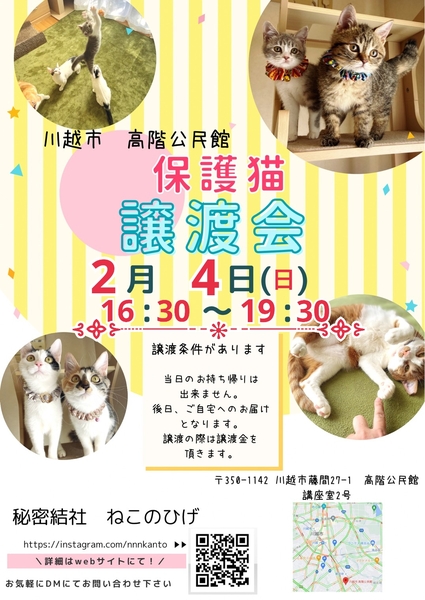 | イベント内容 | 【秘密結社ねこのひげ☆保護猫譲渡会】 2/4(日) 16:30~19:30 ※ナイター開催です♪ 川越市高階公民館 講座室2号 (〒350-1142 埼玉県川越市藤間27-1) ⊰᯽⊱┈──╌❊╌──┈⊰᯽⊱ 昨年末頃に遺棄され、 結果12頭のレスキューとなった 純血っ仔たち。 初期医療+血球・生化学検査など メディカルチェックをクリアし 体調が整った仔から 順次譲渡会デビューをしています☆ 人間に裏切られても… 使い棄てされても… 嬉しいよ♪美味しいよ♪と 全身で甘えてくるとてもいい仔たちです。 その他にも 1才までは仔猫だにゃー♪ オトナの魅力しか勝たん♪ な仔たちが参加予定です♡ 未来のずっとのご家族さまと 愛し愛されな両想いになれますように♡ 是非会いにいらしてください♪ もちろん見学だけでもWelcomeです♪ ご不明な点がございましたら DMにてお問い合わせ下さい☆ (インスタ @nnnkanto) |