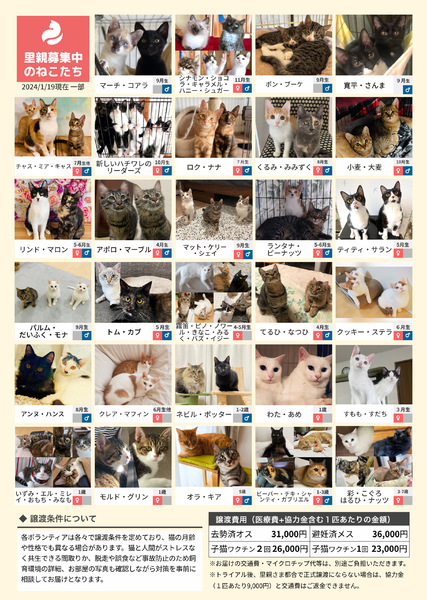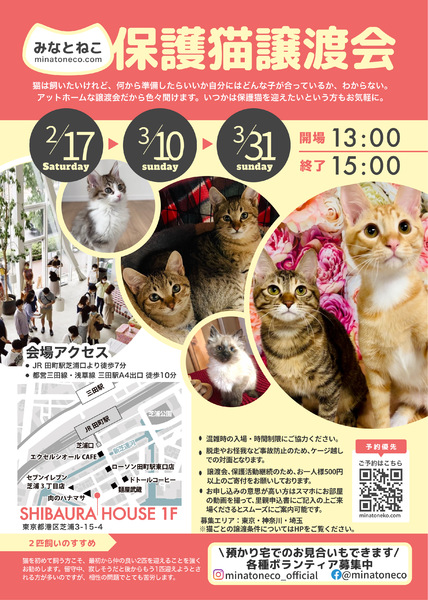 | イベント内容 | みなとねこが毎月定期開催している譲渡会です 2024年も譲渡会を通じて289匹もの猫を161家庭にご縁を繋ぐことができました 譲渡会にはご来場予約が必要です ご予約はみなとねこのHPよりお願いします https://www.minatoneco.com/event 参加猫の詳細はこちら https://www.minatoneco.com/gallery 参加猫たちの様子はYoutubeのみなとねこチャンネルもご覧ください https://youtube.com/playlist?list=PLRxhCqU-Dt77IaUtZCDeratPPI7Jek6ZL ーーー 会場は明るく開放的な雰囲気です Youtube「みなとねこ譲渡会に行ってみよう」 https://youtu.be/8Q4Gti1swQk 30ケージ 60匹ほどの参加となりますが、それ以外の預かり宅の猫もご紹介可能です 子猫は2匹ペアでの譲渡が原則です 初めての方こそ最初から2匹をお勧めしています また私たちボランティアは、ご縁のあった猫たちに終生里親様に愛されて幸せに安全に暮らして欲しいと願っています このため里親になっていただくにはいくつかの条件やお約束事があります。 ◆基本条件(猫それぞれ、保護主により異なります) ・ご家族全員が飼育に賛成であること ・ペット可物件での完全室内飼い、エアコンなどによる室温管理、医師の指示に従い定期的な受診やワクチン接種、 適切な時期(生後4ヶ月中)での避妊去勢、病気予防に配慮したフードの選択、終生飼養をお願いしております。 ・ケージのみの飼育、リビング以外の一室のみでの飼育は不可です。十分な運動のスペースと窓から景色が眺められのんびり日向ぼっこが可能な環境が望ましいと考えています。 ・誤食などの事故防止のため、お部屋の整理整頓や脱走防止にも万全の対策をお願いします。 ・換気が十分でない室内での喫煙をされる方はお断りしております。 ・日々のお世話だけでなく、スキンシップが可能な精神的・時間的・経済的な余裕がある方に限らせていただきます。猫が20年以上生きる中でなるべく変わらぬ環境で愛情を注いで頂けるよう、家族構成やお仕事、お住まいに変化のない方を優先させていただきます。 またお届けやフォローの都合上、募集エリアも東京、神奈川、埼玉に限らせていただいております。 ■里親申込書類一式はみなとねこHPよりダウンロードをお願いします https://www.minatoneco.com/foster-entry 会場では里親申込書を拝見して簡単な面談を行います 会場にてご記入いただくことも可能ですが、面談希望の方が多いとお待ちいただくことになりますので、お手元で印刷していただきご記入の上ご来場いただくことをおすすめしております ※ご家族にアレルギーがある方、喫煙者がいる場合には是非事前にご相談ください ※猫と暮らしたことのない未就学児がいらっしゃる場合には事前にアレルギー検査などお勧めします 実際の参加予定猫 2/16(金)21:00までにみなとねこのHPやFacebookページでご紹介します https://m.facebook.com/minatoneco/ 直接ご応募の方は詳細をLINEなどでやりとりの上で預かり宅でのお見合いも行っております そうした中で譲渡会前に里親様が決定することもございますことご了承ください ※予約優先、30分入替制、混雑時は入場をお待ちいただくなどのご協力をお願いしております ※換気のためにドアをオープンしての開催のためにケージ越しでのご対面となりますことご理解ください ※譲渡会の開催や保護活動の継続のため、お一人様500円以上のご寄付をお願いしております |