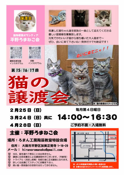| イベント内容 | 「第15回平野ろまねこ譲渡会」を開催致します。 かわいい子猫から落ち着いた大人猫までが参加します! ベテランの保護主が、参加猫達のケアや人馴れ修業を施して皆様とのご縁をお待ちしています! ご予約不要・入場無料です。 見学だけでも歓迎致します。 皆様のお越しをお待ちしております! (会場ではマスク着用と手指の消毒をお願いします。無料のマスクのご用意もあります。譲渡は各保護主により譲渡条件が異なります。会場でスタッフにおたずね下さい。) ●JR平野駅北出口下車、東へ徒歩6分 ●お車では近隣のコインパーキングをご利用下さい。 ●活動インスタグラム https://www.instagram.com/romanekokai/ ●譲渡会参加猫インスタグラム https://www.instagram.com/romaneko_jyotokai/ ●メール hiranoromaneko@gmail.com |