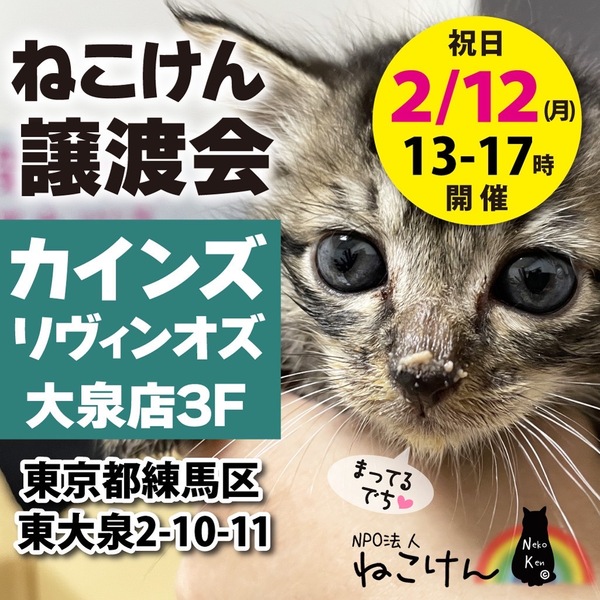 | イベント内容 | ※動物取扱許可申請の関係上、持ち込み及び個人的譲渡は受付できません。 ※当日の健康状態により参加できない猫ちゃんがいる場合もございます。予めご了承下さい。 ※猫ちゃんの当日引き渡しは行っておりません。また譲渡には条件がございます。譲渡条件や譲渡費用に関しては団体へお問合せ頂きますようお願いいたします。 ※当日の12:30~17:30の間は、CAINZ工房がご利用できません。ご理解のほど、よろしくお願い致します。 ペットとしてではなく、生涯家族として猫を迎えて下さる方への譲渡となります。 原則『譲渡会』にて正式なお申込みを承っております。 譲渡会には家族を待っている猫さん達がたくさん参加します♪ ▽▲ねこけん定期譲渡会▲▽ ★毎月第4日曜日は島忠ホームズ仙川店にて開催★ [時間] 12:00〜16:00 [会場] 島忠ホームズ仙川店 〒182-0003 東京都調布市若葉町2-1-7 https://www.shimachu.co.jp/gmshop/tokyo/313.html [交通] ・京王線「仙川駅」より徒歩約5分 ※事前のご予約は必要ございません。ご家族皆様でお越し下さい。 ※混雑時は整理券をお配りし、お待ちいただく場合がございます。 ※屋内での開催となり雨天決行です。 ※猫ちゃんたちとのふれあいはできません。 --- ◆必ずお守り頂く事◆ ①終生飼養 ②完全室内飼養 ③年1回のご報告 ④ペット飼育可能な物件にお住まいであること ただし、以下の該当の方は、譲渡出来ない場合がございます。 ※学生、安定的な収入のない方 ※60歳以上の方は、成猫さんを家族に迎え入れることが出来ます。 里親様のご年齢に応じた成猫の譲渡となりますのでご相談ください。 ◆譲渡費用について◆ 不妊去勢手術・医療費の一部負担をお願いしております。 お届けエリアによっては往復高速料金(実費)を別途ご負担いただく場合がございます。 なお、交通費に関しましては正式譲渡に至らない場合であってもご返却できませんので予めご了承下さい。 ・ご希望の猫さんと家族になるまでの流れ ・譲渡時にかかる一部ご負担金などの詳細 ・譲渡契約書のサンプル等 下記URLに掲載しておりますのでご確認ください。 https://nekoken.jp/jotokai/joto-nagare/ https://nekoken.jp/jotokai/joutokibou/ ◆引き渡し方法◆ 1週間程度のトライアルの後、正式譲渡となります。 必ずご自宅までお届けします。 ◆お届け可能エリアについて◆ 応募可能エリア内であっても、遠方の場合アフターフォローの関係上お断りさせていただくことがございます。 ご心配な際は、前もって市区町村名や最寄り駅等をメールにてお問い合わせいただけますと幸いです。 お手数をおかけいたしますが、何卒ご了承くださいますようお願いいします。 ※譲渡会日程がご予定と合わず個別お見合いご希望の方は、各募集サイトからのご応募 もしくは下記連絡先までお問い合わせください。 ※猫さんの性格や体質により譲渡会に参加することが困難な子もいます。 気になる猫さんの譲渡会への参加情報などは、個別にお問い合わせください。 [連絡先] ご質問等ございましたらお気軽にお問い合わせください。 NPO法人ねこけん東京本部 https://nekoken.jp/inquiry/ nekoken@cat.email.ne.jp [ホームページ] https://nekoken.jp [Instagram] https://www.instagram.com/nekoken2222/ [ブログ・ボラ日記・YouTubeなど] https://linktr.ee/nekoken フォロー・チャンネル登録よろしくお願いします! |