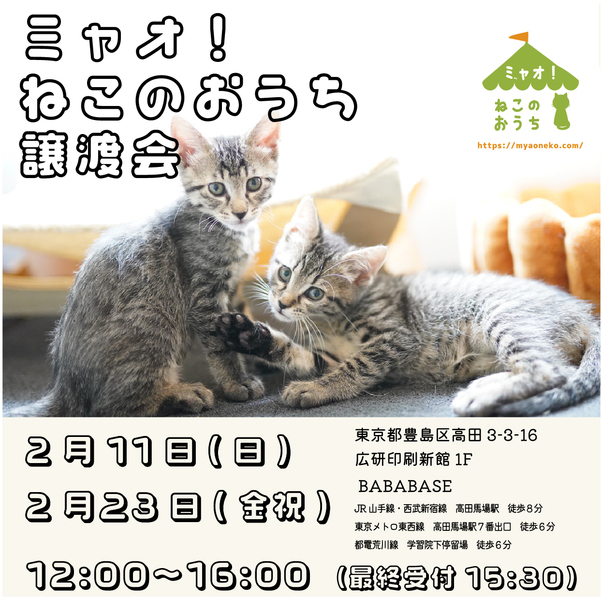 | イベント内容 | 参加する保護猫ちゃんはホームページが最速で更新されます。 およそ譲渡会一週間程前よりホームページにてご確認いただけます。 https://myaoneko.com/cats/ 事前予約はできません。 猫ちゃんをお世話することになるご家族皆様でお越しくださると嬉しいです。 譲渡会場でお会いしましょう♪ 会場にて、以下の点をお願いをしております。 ✿手指消毒 ✿連絡先のご記入 新型コロナウイルスおよび猫さん感染症対策のため、猫さんと触れ合う際には手指消毒をお願いしております。 御来場者多数の場合には入場制限を設けさせていただきます。 ※当日沢山のご来場者様がいらっしゃった場合、整理券をお渡しする事がございます。 会場内外で長時間お待たせする場合もございますが、ご理解くださいますようお願い致します。 結果のご連絡は、当日夜〜翌日夜までの間に、お電話もしくはメールにて保護主より直接ご連絡いたします。 ◇譲渡に関してのお願い 【ミャオ!ねこのおうち】では譲渡に際して、以下の要件をお願いしております。 ・完全室内飼いで終生愛育 ・脱走させないための対策 ・不妊去勢手術 ・譲渡誓約書の取り交わし ・医療費の一部ご負担 ※60才以上の方のみのご家庭、独身や、経済的に困難な世帯、 必要な脱走対策を施していただけない方には原則的に譲渡はご遠慮頂いております。 また、保護主により譲渡条件が異なる場合もございますので会場でご相談ください。 参加予定ねこちゃんは、急な体調不良などで不参加になる場合もございます。 【譲渡に関してのお願い】・【医療費の一部のご負担】・【譲渡までの流れ】など 詳しくは下記ホームページをご覧くださいますよう宜しくお願い致します。 ミャオ!ねこのおうち ホームページ https://myaoneko.com |