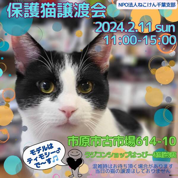 | イベント内容 | 子猫から大人猫まで、沢山の保護猫達が譲渡会に参加します♪ ブログにて、譲渡会に参加する猫さん達を紹介しております。 ねこけん千葉支部ブログ→ https://ameblo.jp/nekoken-chiba/ 通常スタイルの譲渡会と致しますが、コロナウイルス対策として ・会場内ではマスクのご着用と入退室の際は消毒をお願い致します。 ・ご予約無しでお越しいただけますが、混雑時は整理券を配らせていただきます。 ご協力の程よろしくお願い致します。 また、譲渡会会場では、千葉県内にお住いの預かりボランティアさん及びお世話ボランティアさんを募集しています。 ご希望の方は、大変お手数をおかけしますが、譲渡会までお越しください。 ※ご都合がつかない場合は、お問い合わせ先までご相談ください。 [日時] 2月11日(日)11:00~15:00 [会場] 千葉県市原市古市場614-10 ※屋内での開催となり雨天決行です。 ※抱っこもOK! ※猫ちゃんの負担も考え、ご来場は時間内にお願い致します。 ※特にご予約などは必要ございませんのでご家族皆様でぜひお越し下さい。 ※駐車場あり。 [交通] 交通機関を利用してお越しの方 JR内房線 浜野駅より徒歩13分 浜野駅は、東京駅から京葉線→内房線でおよそ50分の距離!! お車でお越しの方 京葉道路蘇我インターより車で10分 ※駐車場はラジコンショップハッピー様裏手にございます駐車場をご利用ください [譲渡ご希望の方へのお願い] 誠に恐れ入りますが下記に当てはまります方への譲渡は不可となりますので予めご了承下さい。 ①学生さん、未成年の方、安定収入のない方 ②ペットを飼う事を許されていない住宅にお住まいの方 ③身体的、精神的疾病で治療中の方 ※60歳以上の方は別途条件がございますのでご相談下さい。 [譲渡の流れ] お申込み→審査→後日お届け→トライアル→正式譲渡 ※当日のお連れ帰りは出来ませんので予めご了承ください。 ※仮譲渡時にご希望の猫ちゃんにかかった医療費(血液検査・ワクチン・駆虫・不妊去勢手術等)をご負担願います。 しかし、正式譲渡に至らなかった場合は医療費を全額返済致します。 [主催] 動物愛護団体 NPO法人ねこけん 千葉支部 [ブログ] https://ameblo.jp/nekoken-chiba/ [参加動物] 成猫・子猫(ねこけん保護猫以外の猫ちゃんも参加予定です) [お問い合わせ] ご不明な点、ご質問等ございましたら下記までお問い合わせください。 chiba.info@nekoken.jp |