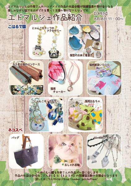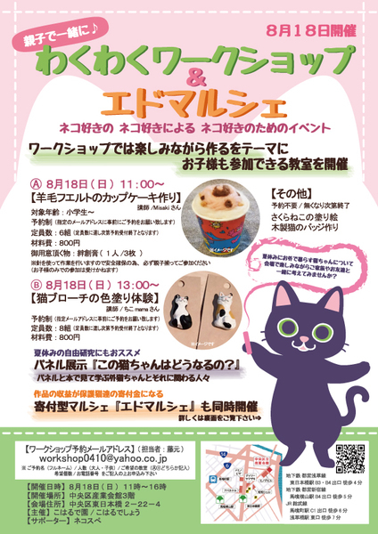 | イベント内容 | 8/18(日)11時~15時 猫好きの 猫好きによる 猫好きの為のイベントを開催します 作って楽しむ「わくわくワークショップ」 それに先立って 「わくわくワークショップ」の予約を開始致します 【A】11時~12時30分 『羊毛フエルトのカップケーキ作り』 定員数:6組 対象年齢:小学生〜 材料費:800円(当日入場時にお支払い) ご持参頂く物:絆創膏(1人3枚) ※針を使って作業を行いますので小学生のお子様は安全確保の為 必ず親子揃ってご参加下さい 【B】13時~14時30分 『猫ブローチの色塗り体験』 定員数:8組 対象年齢:なし 材料費:800円(当日入場時にお支払い) ご持参頂く物:なし ※絵具を使いますので汚れても大丈夫な服装でお越し下さい 【ワークショップ予約受付メールアドレス】 workshop0410@yahoo.co.jp (下記必要事項をご記入のうえメールにてご予約をお願い致します) お名前(フルネーム) 予約人数(大人・子供) ご希望の教室(ⒶⒷどちらかご記入下さい) 希望制作個数(原則1組1個の制作となります) お電話番号 (定員数に達し次第予約受付終了となりますのでご了承下さい) 買って楽しむ「エドマルシェ」 作品の収益は全て「ねこざんまい」「ネコスぺ」を通じて 保護猫達の支援金となる 買って支援の寄付型マルシェです 見て楽しんで買って支援ができる エドマルシェは 猫を迎える事が出来なくても 猫の保護ができなくても出来る 保護猫活動のひとつです 見て学んで楽しむ「パネル展示」 パネルと本をベースに お外で暮らす猫ちゃんについて考えるブースを設けます 「保護猫の譲渡会」 ねこざんまいさん主催の譲渡会も 同一会場にて開催しております 会場には全国から愛らしい猫ちゃん達が 新たな出会いを求めて参加します 【参加猫ちゃん一覧】 https://neko3mai.com/entrycats/entrycats.html イベントブースで学んで体験した後に 保護猫ちゃん達に会ってみる そんなリアルな体験もここなら出来ます 猫好きさんもそうでない方も大歓迎 入場無料のイベントです 電車でも車でもアクセスしやすい会場です (車の方はお近くのコインパーキングをご利用下さい) ぜひぜひ 皆様お誘い合わせのうえイベント会場へお越し下さい |