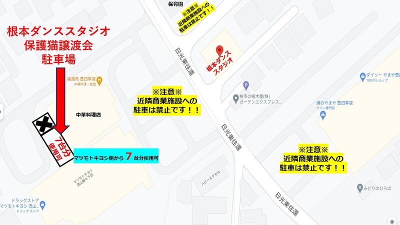 | イベント内容 | 千葉県 柏市近郊の 個人ボランティアさん集まり 毎月定期日曜日に(だいたい第2日曜日)※開催日変更があります 広いダンススタジオで猫と遊びながらの譲渡会を開催しております。 ゲージの中の猫ちゃんとお見合いだけではなく 気に入った猫ちゃんと 遊んだり、抱っこしたりすることができます ボランティアさんともゆっくりお話ができるので 気に入った子のことをどんどん質問してください 参加する猫ちゃんは ・TNR時に保護された子 ・心無い人に遺棄された子 ・愛護センターから引き取り乳飲み子から育てた子 などですので 人に慣れている子が参加します 【会場】 千葉県柏市豊四季301-2 2F【1階はコインランドリーになってます】※譲渡会幟立ててます 根本ダンススタジオ オフィシャルホームページ:https://nemotodance.localinfo.jp/ 会場へのお問い合わせ 080-3258-6363 予約不要・入場無料 ※混みあった時は入場制限を行いますので 予めご了承ください 【お車でお越しの方へ】 ◎近隣の商業施設への駐車は固くお断りしております。 ◎お車は指定の場所(地図参照)に駐車していただけるようお願いいたします。 ◎駐車場でのトラブルにつきましては 自己責任とし、Withねこ及び根本ダンススタジオは 関りがございませんのであらかじめご了承ください 【譲渡までの流れ】 譲渡会(お見合い)⇒申し込み(条件・費用の確認・アンケート記入)⇒各ボランティア審査⇒決定連絡 ☆譲渡が決定しましたら、必要なものをそろえていただき ご都合のいい日時に ご自宅にお届けさせていただきます。 【里親希望の方へお願い】 ☆マスクは自己判断にてお願いします(スタッフも同様) ☆当日、体調により急に欠席になる猫ちゃんがおりますので 予めご了承ください *ペットを連れての譲渡会入場はお断りしています。 *猫の引き取り、保護依頼は受け付けておりません。 *保護猫の体調、悪天候や不測の事態により、予告なく開催が中止・時間短縮になる場合がございます。 *保護猫の当日引渡しは行っておりません。後日ご自宅へのお届けとなります。 *保護猫の譲渡は先着順ではございません。また、譲渡条件および譲渡費用がございます。 *譲渡会参加時には、手指消毒、他のお客様とのソーシャルディスタンス確保にご協力願います。 【主催/お問い合わせ】 Withねこ メールアドレス withneko2222@yahoo.co.jp ホームページ https://nekotomo.localinfo.jp/ ※お問い合わせ画面よりお問い合わせください ※おうちで食べなかったキャットフード・使わなかった猫砂など ございましたらお持ちください。 ご支援をお願いします。 |