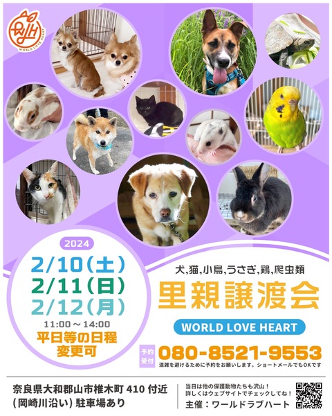 | イベント内容 | ワールドラブハートで里親募集中の動物たちの譲渡会を開催します! 犬猫だけではなく、インコやラット、ウサギにモルモットなどたくさんの保護動物がいます! みんな新しい家族を探しています。写真だけでは伝えきれない魅力が盛りだくさん! 実際に会ってそのかわいさを実感してください♪ ★里親募集中の動物たち★ https://satoya-boshu.net/foster/?@button_name@=search&FosterParent_MemberID=1161 ・犬、猫 ・ウサギ ・インコ ・キンカチョウ ・ウコッケイ ・ヘビ ・カメ ……など 子犬や子猫もたくさんいますよ♡ ぜひお気軽にお越しください! ●混雑をさけるために、事前予約をお願いします。 予約番号080-8521-9553 ショートメールでも可♪ ●当日までに譲渡が決定した・体調がすぐれないなど、やむを得ない理由で不参加の場合があります。ご希望の子がいましたら、当日お問い合わせください。 ●当日、その場での引き渡しはしておりません。譲渡決定後、自宅訪問を兼ねてこちらからお届け致します。 ご来場お待ちしております♪ ★world love heart(ワールドラブハート)は、奈良県大和郡山市で活動している動物保護団体です。 『引き取り依頼は断らない』をモットーに、犬、猫、鶏、小動物、家畜、爬虫類など捨てられた動物を保護しています。 https://worldloveheart-nara.jimdofree.com |