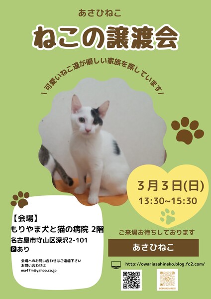 | イベント内容 | 優しい家族を待っている猫たちが 沢山参加します(=゚ω゚=) ♡猫を迎えたい ♡運命の猫ちゃんと出会いたい ♡先住猫ちゃんの仲間探し 皆様のご来場をお待ちしております! 3月3日(日) 13:30〜15:30 ※毎月第1日曜日 会場 もりやま犬と猫の病院 2F 愛知県名古屋市守山区深沢2-101 駐車場あり ※病院へのお問い合わせはご遠慮下さい お問い合わせはコチラ ma47m@yahoo.co.jp ┈┈┈┈┈┈┈┈┈┈ ◎全頭ワクチン接種、ウイルス(FIV、FeLV)検査、マイクロチップ装着済み ◎譲渡には条件がございます 詳しくは下記ブログをご覧ください ↓↓↓ 主催者【あさひねこ】ブログ http://owariasahineko.blog.fc2.com/ |