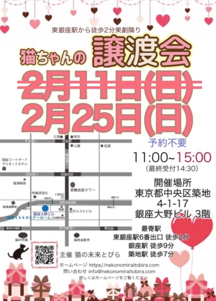 | イベント内容 | 東銀座で保護猫の譲渡会を開催しています「猫の未来とびら」です♪ 恵まれない環境にいる猫たちが未来へのとびらを開いて幸せなご縁に繋がる橋渡しをしていきます。 たくさんの猫ちゃんと保護主・スタッフ一同みなさまのご来場を心よりお待ちしています! 子猫ちゃん〜成猫ちゃんまで参加します♪ ※コロナやインフルエンザ感染防止対策のため、マスクは有効な手段です。 当会としましては、従来通りマスク着用をお願いしたいと思います※ 【ご来場いただく皆様には下記についてお願い致します】 ★不織布マスクの着用をお願い致します。 ★譲渡会場にお入り頂く前に手洗いと手の消毒をお願い致します。 ★熱のある方や体調の優れない方は譲渡会への来場を見合わせて頂けますよう、お願い致します。 ★来場者数によりましては人数制限もありますので長時間お待たせてする場合もございます。 予めご了承下さい。 ★☆★★☆★★☆★★☆★★☆★★☆★★☆★★☆★★☆★ ★開催日時 2024年2月25日(日) 11:00~15:00(最終受付 14:30) ★会場 東京都中央区築地4-1-17 銀座大野ビル 3階 (東劇となり) ★最寄駅 東銀座駅 6番出口 徒歩2分 銀座駅 徒歩9分 ・築地駅 徒歩7分 駐車場は当ビル又は近隣のコインパーキング等をご利用ください。 会場への直接のお問い合わせはご遠慮くださいませ。 ★☆★★☆★★☆★★☆★★☆★★☆★★☆★★☆★★☆★ 会場で猫ちゃんと触れ合ってご縁を繋いでください。 里親様・猫ちゃんが双方、幸せな家族になれるよう保護主・スタッフがサポート致します。 ご不安な事はお気軽にご相談ください。 入場無料です。事前のご予約は不要です。 当日猫ちゃんの引き渡しはございません。 後日、保護主が里親様宅へお届けいたします。 ※参加予定猫ちゃんは、急な体調不良等で不参加になる場合もございます。 開催当日の朝、当会ブログにて不参加の最新情報を掲載致しますのでご確認をお願い申し上げます。 ◇譲渡に関してのお願い・基本条件 1.家族の一員として終生最期まで愛育下さい。 2.完全室内飼い・ペット可のお住まい(契約書を拝見致します) 3.脱走防止対策 4.避妊・去勢手術 5.里親様のご自宅へのお届け 6.譲渡誓約書への署名捺印・身分証明書の提示 7.医療費譲渡金のご負担 8.定期報告 9.トライアル期間有り ※保護主により譲渡条件は異なりますので会場で直接ご相談ください。 60才以上の方のみのご家庭、未成年の方、単身の方、同棲中の方、 小学生低学年以下のお子様のいる方、必要な脱走対策を施していただけない方は譲渡をご遠慮頂く場合もございますのでご了承ください。 仔猫の場合は主にお世話される方のご年齢は55歳までとさせて頂きます。 オーバーする方はご相談くださいませ。 小さな子猫の譲渡は体重が1kgになってからのお届けやお留守番の無い(少ない)ご家庭を希望いたします。 医療費譲渡金に関しましては詳しくはホームページの 【譲渡に関してのお願い】【譲渡の流れ】をご覧くださいませ。 ~主催 猫の未来とびら~ |
