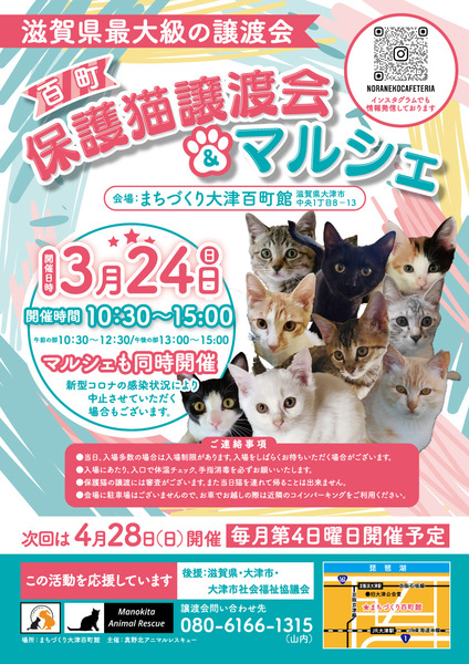 | イベント内容 | 滋賀県最大級の保護猫譲渡会。 毎回40頭以上の猫さんが参加します。 初めての方でも安心して譲渡の安心サポートの譲渡会です。 予約不要、入場無料。 参加猫さんのご紹介は https://ameblo.jp/hyakucyojyoutokai または、Instagram @hyakucyoujyotokai をご覧下さい。 ※ 後援 滋賀県、大津市、大津市社会福祉協議会 |