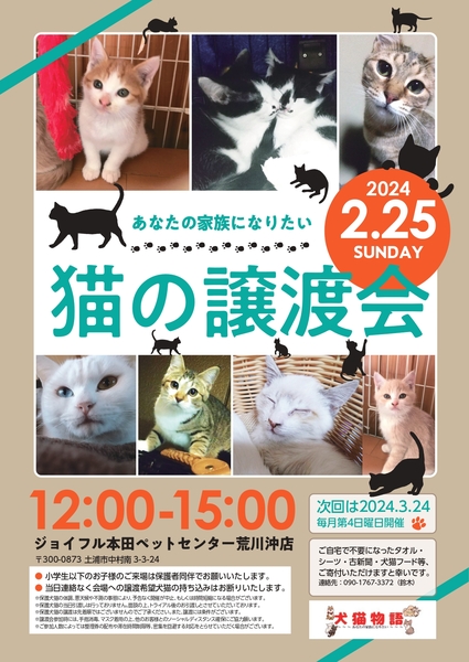 | イベント内容 | ジョイフル本田ペットセンター荒川沖店にての猫の譲渡会です。 あなたとの出会いを待つ猫にぜひ会いにきてくださいませ。 12時~15時開催です!! ●犬猫物語は土浦を中心とし保護活動、野良猫の避妊去勢などを行っている団体です。 犬猫の相談などはお電話くださいませ。 譲渡会への猫の参加も受け付けております。 当日いきなりの参加は不可能ですが、事前にご連絡ください。 お待ちしています(^^ 問い合わせは09017673372鈴木まで。非通知には出ません。 |