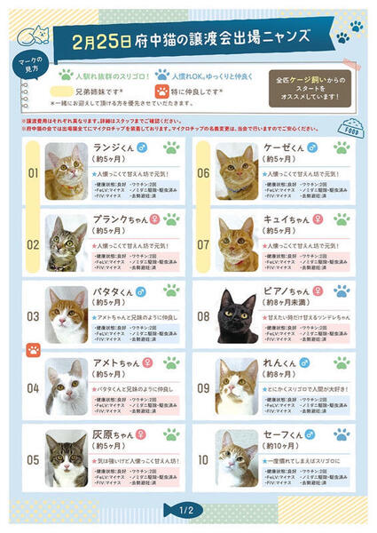 | イベント内容 | ୨୧⌒⌒⌒⌒⌒⌒⌒⌒⌒⌒⌒⌒⌒⌒⌒୨୧ 府中駅直結⭐︎譲渡会のお知らせ ୨୧⌒⌒⌒⌒⌒⌒⌒⌒⌒⌒⌒⌒⌒⌒⌒୨୧ 【日時】2月25日(日)13時〜15時半まで 【場所】LIGHT UP LOBBY (下記のリンクに詳細あり) ※事前に整理券を配布。ご予約は必要ありません。 https://chuneko.exblog.jp/32603337/ ※会場への直接のお問い合わせはお控えください。 ご質問はfuchu_nekonokai@yahoo.co.jpまで こんにちは。『NPO法人府中猫の会』です。 地元のTNR活動&保護活動(野良猫を増やさない取り組みや行き場のない猫達の保護)に尽力しているボランティア団体です。 その他にも、当ボランティアの取り組み『熊本市殺処分STOPプロジェクト』として、131匹の保護猫達を熊本から東京に空輸して参りました。 今回ご披露する猫ちゃん達は、くまっ子空輸にゃんずの他、飼い主から飼育放棄されてしまった捨て猫や、強制執行で夜逃げされた猫達など、どの子達もみんな行き場のない子達ばかりを保護し、育て上げた子達が参加します。 自信を持って、 この度もかわいい子ども達をご紹介させていただきます! 活動内容や保護猫達の様子が気になる方は、ぜひ!YouTubeちゅー猫チャンネルをご視聴ください。 ↓↓↓ ฅ^•ﻌ•^ฅ♡ちゅー猫チャンネル https://youtube.com/@chuneko ◆大きめ子猫ちゃんから成猫さんまで20〜25匹参加予定。 ◆出場にゃんずは、全匹お留守番OKな子達ばかり。 お仕事フルタイムでお持ちのご家庭も、問題なく迎えていただけます。 (大きめの人馴れ抜群の子猫達から、どっしり落ち着いた成猫までご紹介させていただきます) ◆血液検査、ワクチン2回接種、マイクロチップ装着、全ての医療を終えております。ご安心ください。(※3ヶ月未満の子猫達は里親様に手術を託しております) ◆全匹、家猫訓練、トイレ訓練が完璧。 パーフェクトな状態でお届けいたします。 猫飼い初心者の方にOKな猫ちゃんも沢山います。 ◆こどものために保護猫を迎えたい、というご家庭も大歓迎! お子様が保護猫達と一緒に育つ事により、命に優しい情操教育となると願うからです。 (※お子様の健康を守る為にも猫に接触した事のない場合、事前のアレルギー検査をおすすめします) ◆60代、70代の方で里親を希望される方には成猫をオススメしております。60歳以上の方は必ず後継人をお願いしております。後継人の方と譲渡会にご来場くださると私達も選考しやすいです。 【譲渡会にご参加くださる方々へ】 ₍ᐞ•༝•ᐞ₎◞ ̑̑ ◎混雑を防ぐ為、入場制限をさせていただきますが、ご予約の必要はございません。 入り口カウンターにてスタッフが整理券を配布いたしますのでご協力お願い申し上げます。 ₍ᐞ•༝•ᐞ₎◞ ̑̑ ◎初めて猫ちゃんを迎える方(特にお子様のいるご家庭)は、猫アレルギーの有無を明確にしてくださると選考しやすいです。 ₍ᐞ•༝•ᐞ₎◞ ̑̑ ◎譲渡会はお見合いのみの場となっております。 ご来場前に必ず下記の事項をご参照ください。 ▶︎譲渡会のシステムについて◀︎ https://chuneko.exblog.jp/32604872/ 【見学希望やご支援者の方々へ】 ₍ᐞ•༝•ᐞ₎◞ ̑̑ いつもありがとうございます♡ 会場はホテルのカフェとなっております。 お飲み物をご注文くださればお席にご案内いたします。(入口スタッフに一言お申し出ください。) 大変申し訳ないのですが、里親希望の方々を優先的にご案内させていただくのをご了承の上、お越し下されば幸いです。 会場では、ちゅー猫オリジナルグッズも販売しております。 |