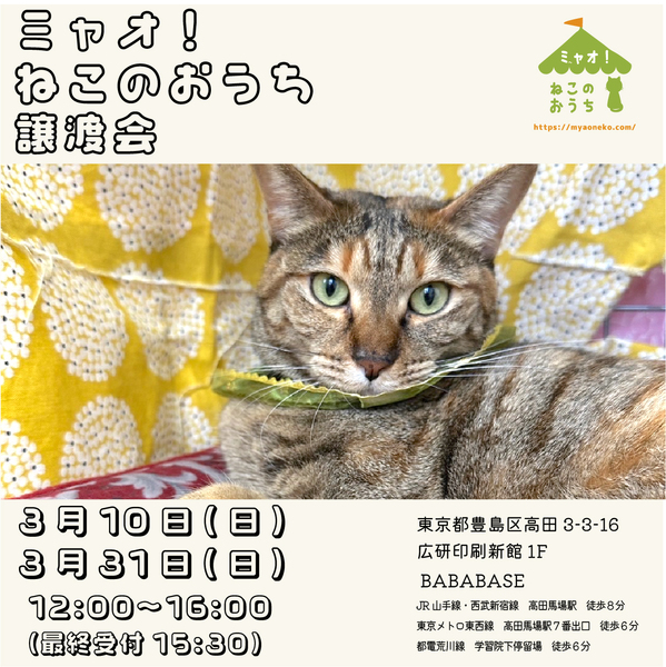 | イベント内容 | 参加する保護猫ちゃんはホームページが最速で更新されます。 およそ譲渡会一週間程前よりホームページにてご確認いただけます。 https://myaoneko.com/cats/ 事前予約はできません。 猫ちゃんをお世話することになるご家族皆様でお越しくださると嬉しいです。 譲渡会場でお会いしましょう♪ 会場にて、以下の点をお願いをしております。 ✿手指消毒 ✿連絡先のご記入 新型コロナウイルスおよび猫さん感染症対策のため、猫さんと触れ合う際には手指消毒をお願いしております。 御来場者多数の場合には入場制限を設けさせていただきます。 ※当日沢山のご来場者様がいらっしゃった場合、整理券をお渡しする事がございます。 会場内外で長時間お待たせする場合もございますが、ご理解くださいますようお願い致します。 結果のご連絡は、当日夜〜翌日夜までの間に、お電話もしくはメールにて保護主より直接ご連絡いたします。 ◇譲渡に関してのお願い 【ミャオ!ねこのおうち】では譲渡に際して、以下の要件をお願いしております。 ・完全室内飼いで終生愛育 ・脱走させないための対策 ・不妊去勢手術 ・譲渡誓約書の取り交わし ・医療費の一部ご負担 ※60才以上の方のみのご家庭、独身や、経済的に困難な世帯、 必要な脱走対策を施していただけない方には原則的に譲渡はご遠慮頂いております。 また、保護主により譲渡条件が異なる場合もございますので会場でご相談ください。 参加予定ねこちゃんは、急な体調不良などで不参加になる場合もございます。 【譲渡に関してのお願い】・【医療費の一部のご負担】・【譲渡までの流れ】など 詳しくは下記ホームページをご覧くださいますよう宜しくお願い致します。 ミャオ!ねこのおうち ホームページ https://myaoneko.com |