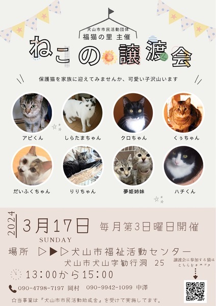 | イベント内容 | 【ココがポイント!】 ★ウイルスチェックなど健康診断済み! 【日時】 3月17日(日)13~15時 【場所】 犬山市福祉活動センター (犬山市犬山字勧行洞25) 予約不要 広々駐車場あり 福猫の里 犬山「福猫の里便り」 https://hukunekonosato.hatenablog.com/ 問い合わせ先(福猫の里 犬山) a-saoka.922@outlook.com ーーーーーーーーー 【お約束】 当日、会場での猫の引き渡しはしておりません。 後日ご自宅までお届けします。 お試し飼育(トライアル)を1週間して頂き、双方が納得の上で正式譲渡となります。 譲渡の際は、医療費の一部の負担をお願いしております。(ワクチン代 等) ・ペット可のお住まい ・完全室内飼育、終生飼育 ・適切な医療措置 ・不妊手術の実施と報告等、お約束があります。 |