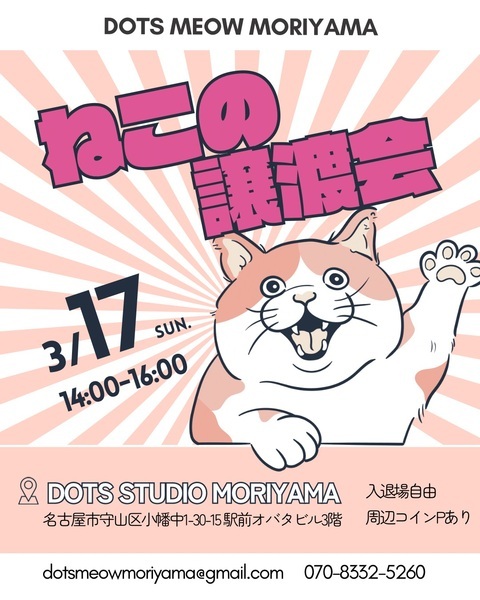 | イベント内容 | \ ねこの譲渡会のお知らせ! / ▶︎ 3 /17(日)ねこの譲渡会を開催します! 日時:2024年 3月 10日(日) 14:00〜16:00 場所:DOTS STUDIO MORIYAMA (名古屋市守山区小幡中1-30-15 駅前オバタビル3階) ▶ 入退場自由 | 駐車場あり ▶ 参加する保護ねこたちの愉快な暮らしは、 インスタグラムでほぼ毎日公開しています! ▼インスタはこちらから▼ 【 https://www.instagram.com/dotsmeowmoriyama 】 個性爆誕な保護ねこたちに、ぜひ会いに来てくださいね! ————————————— \「保護ねこを応援したい!」皆さまへ ? / ねこちゃんを迎えてあげられなくても、 いろんな方法で応援することができます。 ◤ ①オリジナルグッズの販売をしています ✉️ プロフィールにある「ショップ」から飛べます。 DOTS STUDIO MORIYAMAでは、イベント開催日に オリジナルグッズの対面販売もしていますので、 お買い求めだけのご来場もオッケーです! ◤ ②保護ねこに「ギフト」が贈れます ? amazon保護犬・保護猫支援プログラムに参加しています。 プロフィール欄にあるURLをみてね! ◤ ③「フォロー」や「いいね!」で応援できます ? 一人ひとりのフォローや、 一つひとつの「いいね!」や「保存」が、 私たちにとって大きな応援になっています。 皆さまの小さくて大きなアクションが、 ずっとのおうちとの出会いにつながっていくかも! ぜひフォローしてね! ▼インスタはこちらから▼ 【 https://www.instagram.com/dotsmeowmoriyama 】 ————————————— 【 お 知 ら せ 】 「のらねこのにゃんでも相談会」のご予約も、 随時受け付けています。 にゃんでも相談会は、事前予約が必要です。 詳細はプロフィールのトップに固定してある投稿 または ハイライトの「そーだん会!」をご覧ください。 ————————————— ▶ DOTS MEOW MORIYAMAによる野良猫に関する相談支援事業「#のらねこのにゃんでも相談会 」は、名古屋市社会福祉協議会の地域の支え手応援事業「地域の困りごと解決応援助成事業」(名古屋市福祉基金財源)により、助成を受けて実施しています。 |