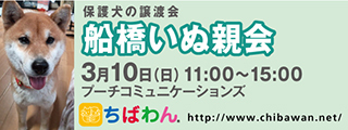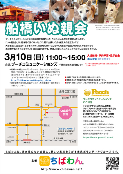 | イベント内容 | 3月船橋いぬ親会のご案内です。 poochさんのご厚意により、プーチコミュニケーションズ(船橋市駿河台)のドッグランをお借りして「船橋いぬ親会」を開催することになりました。 屋根付きのドッグランでの開催になります。 【ちばわんからのお願い】 ①会場内ではマスクの着用をお願いします。 ②発熱がある方や体調が悪い方は来場をご遠慮ください。 ③会場内が密にならないよう入場制限をさせていただく場合があります。 開催日:3月10日(日)11:00~15:00 屋外開催(屋根付きドッグラン) 小雨決行 場所:プーチコミュニケーションズ 千葉県船橋市駿河台2-9-1 【アクセス】 飯山満駅から徒歩約20分 JR東船橋駅から徒歩約20分 県道8号線 吹上交差点~駿河台交差点間にあるファミリーマートの裏手になります。 リサイクルショップとファミリーマートの間の道へ進み、最初のT字路を左折してください。 ※店舗の駐車場は5台分のみとなりますので混雑時にはご利用いただけない場合がございます。 満車の場合はコインパーキングをご利用下さい。 《お知らせ》 ◆会場ではチャリティグッズを販売します 売上金は保護した犬猫の医療費など、 ちばわん活動費として大切に使わせていただきます 《お問い合わせ》 いぬ親会について:http://chibawan.net/inquiry_chiba ※いぬ親会当日はメールが見られません。また、お問い合わせの際は、必ず「具体的な件名」を入れて多数の迷惑メールと区別がつくようにお願いいたします。 ※本イベントに関するPoochさんへのお問い合わせはご遠慮ください。 船橋いぬ親会イベントホームページ https://chibawan.net/event/20240310-funabashi-dog ちばわんホームページ https://chibawan.net/ |