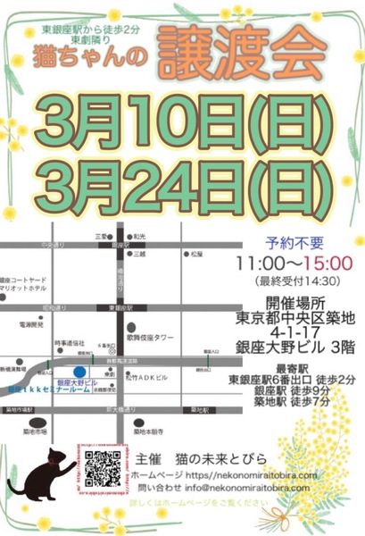 | イベント内容 | 東銀座で保護猫の譲渡会を開催しています「猫の未来とびら」です♪ 恵まれない環境にいる猫たちが未来へのとびらを開いて幸せなご縁に繋がる橋渡しをしていきます。 たくさんの猫ちゃんと保護主・スタッフ一同みなさまのご来場を心よりお待ちしています! 子猫ちゃん〜成猫ちゃんまで参加します♪ ※コロナ対策のマスク着用が緩和され, マスクを着用するかどうかは個人の判断となりましたが、 感染防止対策の上では、マスクは有効な手段です。 当会としましては、従来通りマスク着用をお願いしたいと思います※ 【ご来場いただく皆様には下記についてお願い致します】 ★不織布マスクの着用をお願い致します。 ★譲渡会場にお入り頂く前に手洗いと手の消毒をお願い致します。 ★熱のある方や体調の優れない方は譲渡会への来場を見合わせて頂けますよう、お願い致します。 ★来場者数によりましては人数制限もありますので長時間お待たせてする場合もございます。 予めご了承下さい。 コロナウイルス感染防止の為、大変恐縮ですが何卒ご理解とご協力、ご了承をいただけますようお願い致します。 ★☆★★☆★★☆★★☆★★☆★★☆★★☆★★☆★★☆★ ★開催日時 2024年3月10日(日) 11:00~15:00(最終受付 14:30) ★会場 東京都中央区築地4-1-17 銀座大野ビル 3階 (東劇となり) ★最寄駅 東銀座駅 6番出口 徒歩2分 銀座駅 徒歩9分 ・築地駅 徒歩7分 駐車場は当ビル又は近隣のコインパーキング等をご利用ください。 会場への直接のお問い合わせはご遠慮くださいませ。 ★☆★★☆★★☆★★☆★★☆★★☆★★☆★★☆★★☆★ 会場で猫ちゃんと触れ合ってご縁を繋いでください。 里親様・猫ちゃんが双方、幸せな家族になれるよう保護主・スタッフがサポート致します。 ご不安な事はお気軽にご相談ください。 入場無料です。事前のご予約は不要です。 当日猫ちゃんの引き渡しはございません。 後日、保護主が里親様宅へお届けいたします。 ※参加予定猫ちゃんは、急な体調不良等で不参加になる場合もございます。 開催当日の朝、当会ブログにて不参加の最新情報を掲載致しますのでご確認をお願い申し上げます。 ◇譲渡に関してのお願い・基本条件 1.家族の一員として終生最期まで愛育下さい。 2.完全室内飼い・ペット可のお住まい(契約書を拝見致します) 3.脱走防止対策 4.避妊・去勢手術 5.里親様のご自宅へのお届け 6.譲渡誓約書への署名捺印・身分証明書の提示 7.医療費譲渡金のご負担 8.定期報告 9.トライアル期間有り ※保護主により譲渡条件は異なりますので会場で直接ご相談ください。 60才以上の方のみのご家庭、未成年の方、単身の方、同棲中の方、 小学生低学年以下のお子様のいる方、必要な脱走対策を施していただけない方は譲渡をご遠慮頂く場合もございますのでご了承ください。 仔猫の場合は主にお世話される方のご年齢は55歳までとさせて頂きます。 オーバーする方はご相談くださいませ。 小さな子猫の譲渡は体重が1kgになってからのお届けやお留守番の無い(少ない)ご家庭を希望いたします。 医療費譲渡金に関しましては詳しくはホームページの 【譲渡に関してのお願い】【譲渡の流れ】をご覧くださいませ。 ~主催 猫の未来とびら~ |