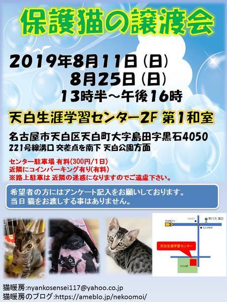 | イベント内容 | 天白生涯学習センター2階 第1和室 天白生涯学習センターで保護猫の譲渡会を開催します。 見学のみも歓迎です♫ 子猫も若猫も性格も安定した大人猫も ずっとのおうちを探しています。 今回は 幸運の黒猫、強運の黒猫、黒猫と思いきや黒白、個性的な白黒猫、正統派三毛猫など バリエーション豊富でお待ちしております(*☻-☻*) 希望者の方にはアンケート記入をお願いております。 条件等を確認の上 保護主と希望者様 双方 合意できましたら 後日 ご自宅までお届け(トライアル)させて頂きます。 ご希望に添えない場合もございます。 個々の保護猫それぞれの月齢や性格をふまえて保護主が判断を致します。 ご了承下さいませ。 当日、猫をお渡しする事はございません。 また 猫の引き取りも致しません。 生涯学習センター駐車場(300円/1日) 駐車可能台数に限りがございます。 近隣にコインパーキング有。 路上駐車は 近隣のご迷惑になりますのでおやめください。 |