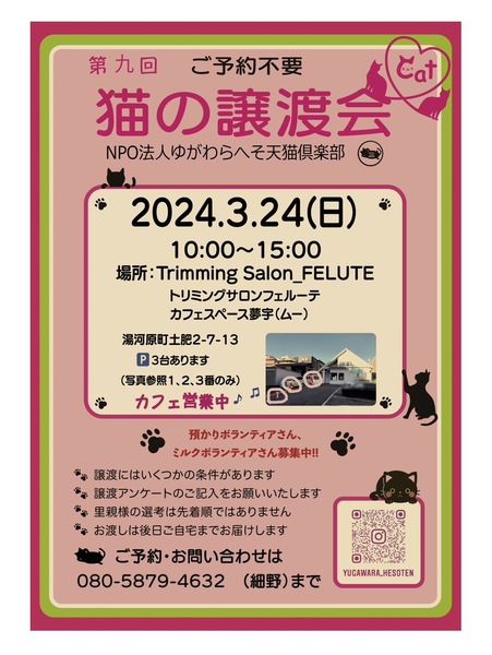 | イベント内容 | 湯河原町で猫の譲渡会を開催します。 駅から海に向かって歩いてください。湯河原郵便局の裏手側です。 カフェもご利用頂けますよ。(カフェ代金はかかります)預かりスタッフと普段の様子や、気掛かりな事、心配事なんでも話してゆっくり猫の様子をご覧ください。 家族を探している沢山の猫ちゃん達が参加します。事前にご希望のこがいればご連絡くださいね。 ミルクボランティアさん 預かりボランティアさん シニアの預かりボランティアさん ボランティアスタッフも募集しています。 是非遠慮なく様子を見に来てください。 ウエルカムです‼️ お待ちしています。 |