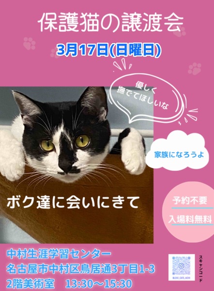 | イベント内容 | 場所)中村区生涯学習センター 2階美術室 ボランティアが共同で開催する保護猫の譲渡会です。予約や入場料は必要ありません。 可愛い猫達に会いにきてください。 (当日は連れて帰れません) |