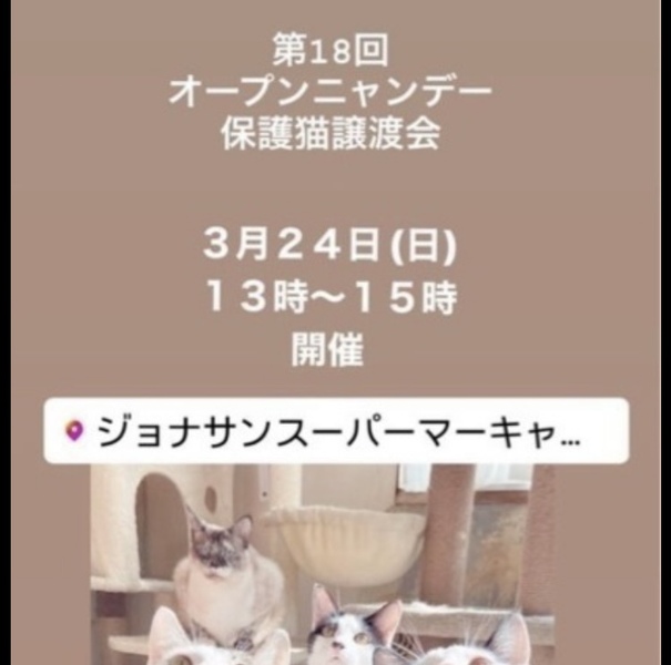 | イベント内容 | ジョナサンスーパーマキャットさんの主催する譲渡会に参加させていただける事になりました。 5ヶ月の子4匹参加になります。 黒 雄 5ヶ月 エイズ白血病 陰性 ワクチン2回済み 黒 雌 4ヶ月 エイズ白血病 陰性 ワクチン2回済み グレー雌5ヶ月 エイズ白血病 陰性 ワクチン2回済み パステル三毛猫 5ヶ月 エイズ白血病 陰性 ワクチン2回済み よろしくお願いします |