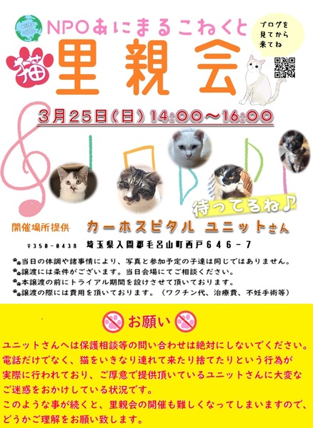 | イベント内容 | 直前に更新されるブログをチェックをしてからお越しください♪ グッズ販売もあります♪ ※先着順ではなく里親会後に協議してより良い条件のご家族を選定させて頂いておりますので、お時間早い方が有利という事はありません^^ |