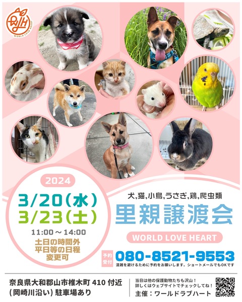 | イベント内容 | ワールドラブハートで里親募集中の動物たちの譲渡会を開催します! 犬猫だけではなく、インコやラット、ウサギにモルモットなどたくさんの保護動物がいます! みんな新しい家族を探しています。写真だけでは伝えきれない魅力が盛りだくさん! 実際に会ってそのかわいさを実感してください♪ ★里親募集中の動物たち★ https://satoya-boshu.net/foster/?@button_name@=search&FosterParent_MemberID=1161 ・犬、猫 ・ハムスター←現在、子ハムスターがたくさんいます! ・ウサギ←12羽います! ・インコ ・キンカチョウ ・ウコッケイ ・ヘビ ・カメ ……など 子犬や子猫もたくさんいますよ♡ ぜひお気軽にお越しください! ●混雑をさけるために、事前予約をお願いします。 予約番号080-8521-9553 ショートメールでも可♪ ●当日までに譲渡が決定した・体調がすぐれないなど、やむを得ない理由で不参加の場合があります。ご希望の子がいましたら、当日お問い合わせください。 ●当日、その場での引き渡しはしておりません。譲渡決定後、自宅訪問を兼ねてこちらからお届け致します。 ご来場お待ちしております♪ ★world love heart(ワールドラブハート)は、奈良県大和郡山市で活動している動物保護団体です。 『引き取り依頼は断らない』をモットーに、犬、猫、鶏、小動物、家畜、爬虫類など捨てられた動物を保護しています。 https://worldloveheart-nara.jimdofree.com |