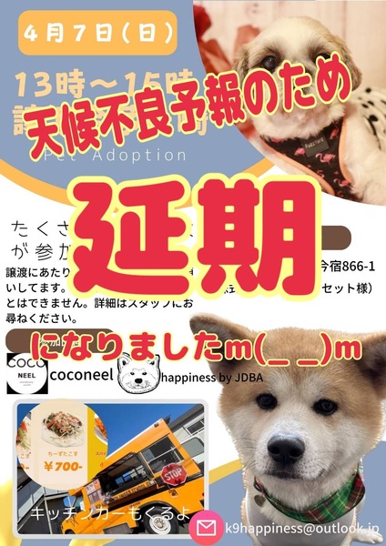 | イベント内容 | COCO NEEL譲渡会IN横浜 2024.4.7(日) ・会場・ 茅ヶ崎市今宿866-1 駐車場の用意はありません。 近隣のコインパーキングのご利用をお願いいたします。 ・時間・ 13:00~15:00 ※参加犬詳細はブログでご確認お願いします。 ※雨天中止と追記お願いします? https://ameblo.jp/coconeel-animalrights |