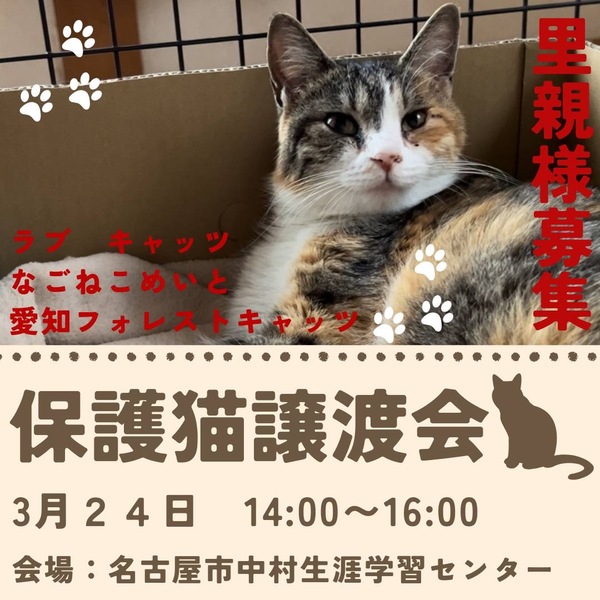 | イベント内容 | 保護猫の譲渡会を3つのボランティア共同で開催します。 予約、入場料共に要りません。 譲渡会初めてという方も大歓迎! 可愛い猫達と触れ合って気さくなスタッフに何でも質問して下さい。 運命の出会いがきっとあります。 |