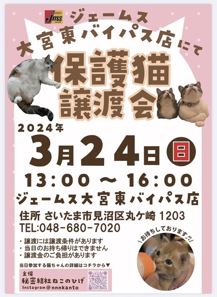 | イベント内容 | 3/24(日)13:00~16:00は♪ ジェームス大宮東バイパス店 〒337-0001 さいたま市見沼区丸ヶ崎1203 にて♪ 秘密結社ねこのひげ 保護猫譲渡会を開催します☆ カー用品を見に来たらば… 保護猫譲渡会をやっててビックリ! (⊙⊙)ファッ!? 車のメンテナンスに来たらば… 保護猫がいぱーーい♪で (*´Д`*)ハァハァ♡ 新しい家族を探しに来たらば… 出逢っちゃった♡ (o・ω[+]ロックオン!! などなど♪ お迎え目的の方はもちろんのこと そうでない方も!! 是非お気軽にお立ち寄りくださいませ☆ (ΦωΦ)ココロヨリオマチシテマース♡ ご不明な点がございましたら インスタグラム @秘密結社ねこのひげ の DMまでお問い合わせ下さい☆ |