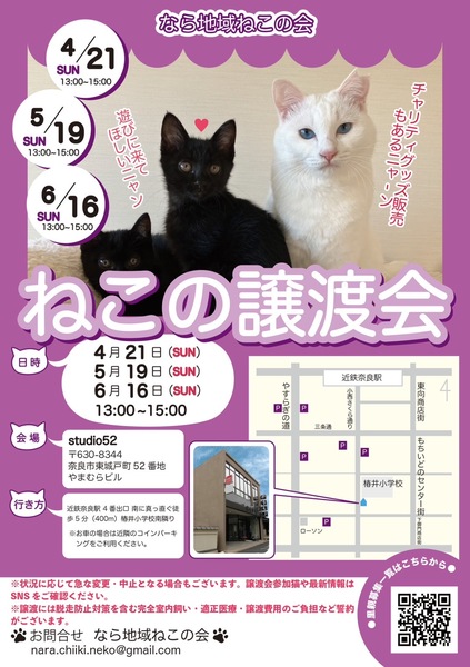 | イベント内容 | 毎月奈良市ならまちにて猫の譲渡会を行っております。 会場には会の保護猫ちゃんたちをはじめ、個人で活動されているボランティアさんが保護した猫や一般の方に保護され里親さんを探している保護猫など、沢山の保護猫たちが里親さんとのご縁を待っています。 また、会場ではチャリティグッズ販売も行っております。 皆さまのお越しをお待ちしております(=^・^=) 参加猫の詳細は https://www.facebook.com/nara.chiiki.neko/ https://www.instagram.com/nara.chiiki.neko/ にて告知します。 ※譲渡会の急な変更がある可能性もございます。最新の情報はSNSにてご確認お願いいたします。 |