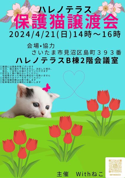 | イベント内容 | おかげさまでハレノテラス保護猫譲渡会は「5年目」を迎えることができました 参加予定猫⇒https://www.youtube.com/shorts/qdJhG53rIY8 埼玉県 さいたま市近郊の 個人ボランティアさん集まり 毎月定期日曜日に(だいたい第1日曜日及び第3日曜日)※イベントなどで開催日変更があります 見沼区の大型ショッピングモール ハレノテラス様の全面ご協力により ハレノテラスB棟2階会議室をお借りして 譲渡会を開催しています。 https://www.youtube.com/shorts/OFHdrXHZAWE ☆2019年3月より開催しております しあわせにゃんこになった数は 400匹以上です 【ハレノテラス】http://hare-terra.com/ ☆TNR時に見つけた リターンできない人慣れした猫たちの保護猫譲渡会です。 【交通】 ☆電車の場合☆ JR宇都宮線(上野東京ライン・湘南新宿ライン) 東大宮駅東口からまっすぐ徒歩1km (約13分) ☆お車の場合☆ 国道16号東大宮バイパス「深作中」から車で約3分 無料駐車場 320台あり ◎とてもきれいな会議室をお借りしているのでゆっくりお見合いがができます ◎小さいお子さんがいらしても大丈夫です ◎2階までエレベーターもございます ◎当日の猫の状態にもよりますが(興奮していないとか)スタッフ許可の元 だっこもできます ◎買い物をしているお客様の邪魔にならないので スタッフともじっくりお話ができます 【譲渡までの流れ】 譲渡会(お見合い)⇒申し込み(条件・費用の確認・アンケート記入)⇒各ボランティア審査⇒決定連絡 ☆譲渡が決定しましたら、必要なものをそろえていただき ご都合のいい日時に ご自宅にお届けさせていただきます。 【里親希望の方へお願い】 ☆当日猫は連れて帰れません ☆譲渡には条件があり、一部費用のご負担その他、揃えていただきたいゲージ等のご用意もあります。 ☆マスクは自己判断にてお願いします(スタッフも同様) ☆当日、体調により急に欠席になる猫ちゃんがおりますので 予めご了承ください ★猫の保護依頼は行いませんのでご相談等もご遠慮ください 【主催/お問い合わせ】 Withねこ Instagram:https://www.instagram.com/withneko2222/ メールアドレス withneko2222@yahoo.co.jp ホームページ https://nekotomo.localinfo.jp/ ※お問い合わせ画面よりお問い合わせください ※おうちで食べなかったキャットフード・使わなかった猫砂など ございましたらお持ちください。 ご支援をお願いします。 |