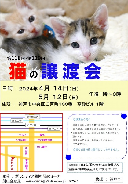 | イベント内容 | 大人猫も6ヶ月の仔猫も参加予定です。 可愛い姿を見に来てください 猫たちが幸せになるために、新しいお家を求めて参加します(=^・^=) 猫は後日こちらからお届けをさせて頂き、お家の環境を見せて頂ければと思います。 仔猫は20年くらい生きる子もいますので、ご自身の年齢に合った猫さんとの出会いを探しに来てください。 ペット不可にお住まいの方はご遠慮ください!(ご確認してください。) 譲渡には条件が多数ありますので、ご理解くださいませ<m(__)m>。 まずはお試しで猫との相性を見てから、正式譲渡となります。 また、猫を保護して里親を探そうと思われている方も、〖参加猫の募集〗をしていますので、お申し込みくださいね! アドレス miina0807@y5.dion.ne.jp にご連絡をください。 お越しの際は各路線の三宮駅からは徒歩10分くらい、車でお越しの場合は近隣のコインパーキングなどにお停めください。 当日、体調の悪い方、発熱がある方、このような方はご遠慮ください。 定例の毎月は第2日曜日に譲渡会を開催しておりますので、次回の出会いに期待をしてくださいね。 ブログ: 猫のミーナといっしょ http://miina300.blog.fc2.com/ ねこのオカン https://ameblo.jp/miina300/ |