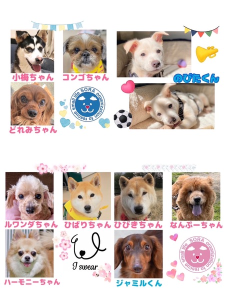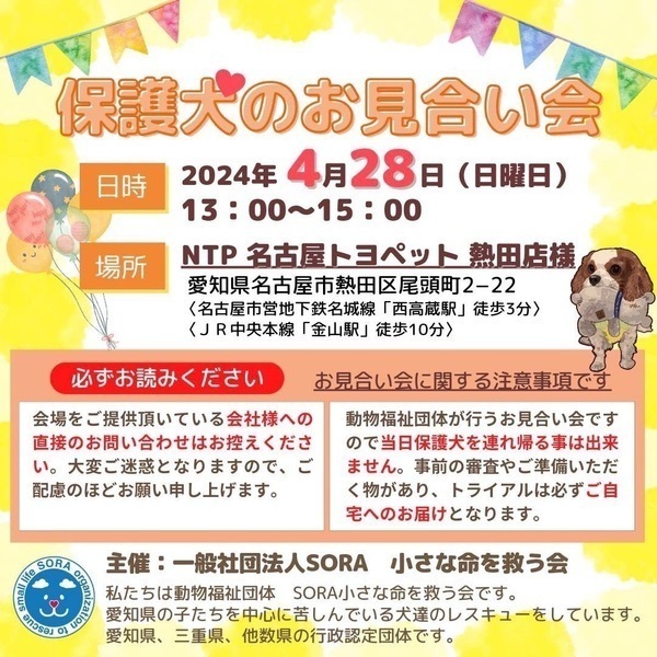 | イベント内容 | 保護犬のお見合い会を開催致します。 ぜひ可愛い保護っ子達に会いに来て下さいね。 チャリティーグッズの収益は、全て保護犬の医療など保護活動使わせていただきます。 事前のお申込みは不要です。保護活動ブログで、開催日の数日前に譲渡会参加が決定したワンコたちのご案内もしておりますので、ご希望のワンコの参加をご確認してお越し頂けますと幸いです。 SORA公式ホームページ https://sora-chiisana.org/foster/ SORA公式活動メインブログ https://ameblo.jp/sora-chiisana-inochi/ SORAイベントブログ https://ameblo.jp/sora-charity-events/ |