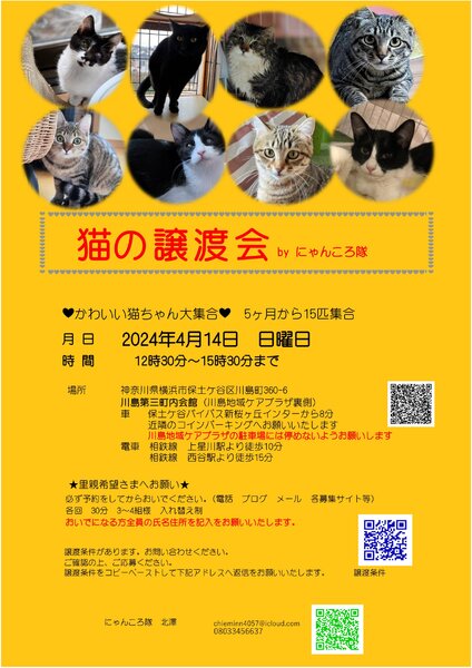 | イベント内容 | 猫ちゃんの譲渡会を開催いたします。 5ヶ月位からの猫さん15匹位 大人猫さんも参加です。 月 日 2024年 4月14日 日曜日 時 間 12時30分~15時30分まで 場所 神奈川県横浜市保土ケ谷区川島町360-6 川島第三町内会館(川島地域ケアプラザ裏側) 車 保土ケ谷バイパス新桜ヶ丘インターから8分 近隣のコインパーキングにお願いいたします。 (手前にある川島地域ケアプラザの駐車場には停めないでください) 電車 相鉄線 上星川駅より徒歩10分 相鉄線 西谷駅より徒歩15分 ★里親希望さまへお願い★ 必ず予約をしてからおいでください。 各回 30分 3~4組様 おいでになる方全員の氏名住所を記入をお願いいたします。 譲渡条件があります。お問い合わせください。 ご確認の上、ご応募ください。 猫の譲渡について http://nyankorotai.blog.fc2.com/blog-category-5.html 上記の譲渡条件をコピーペーストして下記アドレスへ送ってください。 追ってご連絡いたします。 お電話にても受付いたします。 下記の譲渡条件を送ってくださっても大丈夫です。 ◆ご応募時に下記事項をお知らせください◆ 1.お名前、簡単な住所 2.先住動物の有無(ワクチン 不妊手術の有無等)と選んだ理由 3.家族構成(家族全員の年齢 関係 お仕事等) 4.住宅環境(一戸建て 分譲マンション 一戸建て賃貸 賃貸マンションペット可) 5.留守番の時間 6.下記の①~⑧までの同意 ◆応募者様へのお願い◆ ①一生涯、家族の一員としてくださる事(猫は20年生きます) ②完全室内飼いでお願いします。 (脱走防止対策をお願いします。ケージ 脱走防止扉 玄関窓等) ③不妊手術及び毎年のワクチン接種など健康管理 (不妊手術済のご連絡は必須) ④家族全員の同意があること ⑤ペット可住宅にお住まいであること。 (ペット不可にお住まいの方には譲渡できません) ⑥身分証明の提示及び誓約書を記入していただきます。 ⑦譲渡後の近況報告をしていただける方 ⑧譲渡費用等をご負担できる方 (初期医療行為は済ませてお届けします) 猫が小さい場合はお留守番の短い家を希望します。 ケージのご用意をお願いいたします。 申し訳ありませんが先住動物さんが4匹以上のご家庭はお断りさせていただいております。 無職 学生 未成年の方からの申込は受け付けておりません。 ご家族に未就学児のいるお家及び高齢者の方は要相談 2匹一緒を優先させていただきます。 双方の条件が合った場合は譲渡会又は保護先にお見合にきていだだき成立後に自宅室内へお届けいたします。 この時期なので近くに方を優先させていただく事もあります。 ご連絡お待ちしております。 にゃんころ隊 http://nyankorotai.blog.fc2.com 担当 北澤(にゃんころ隊) chieminn4057@icloud.com |