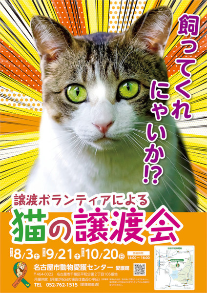 | イベント内容 | 譲渡会のご案内 【主催】 名古屋市動物愛護センター https://www.facebook.com/nagoya.doubutuaigocenter 【日時】 2019年9月21日(土) 14:00~16:00 【場所】 名古屋市動物愛護センター愛護館 名古屋市千種区平和公園2丁目106番地 地下鉄名城線「自由ヶ丘」駅下車 徒歩13分 ◎車でお越しの方は平和公園内駐車場をご利用ください https://goo.gl/maps/URWTnbhqSWp 当センターに登録した譲渡ボランティアの保護している猫たちが多数参加します。 どのねこ達も、新しい家族を探し中! 譲渡ボランティア活動に興味がある方もぜひお立ち寄りください。 ★ご来場者様へ★ ※入場無料、予約不要です ※トライアルや譲渡の条件は各譲渡ボランティア団体に準じます ※猫は後日保護主がご自宅までお連れします ※混雑する場合、入場制限をさせていただくことがございます ★参加する猫たちについて★ ・ノミダニ駆除済 ・ワクチン接種済 ・避妊去勢手術済(6ヶ月未満の子猫除く) ・ウィルス検査済(6ヶ月未満の子猫除く) 猫たちが素敵な出会いを待っています。 譲渡会に関するお問い合わせは 名古屋市動物愛護センター 愛護企画係 a7620380-01@kenkofukushi.city.nagoya.lg.jp までお願いします。 |