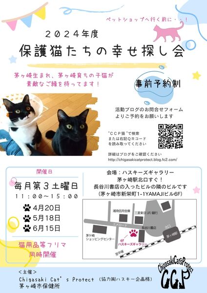 | イベント内容 | 募集については下記ブログをご参照下さい。 http://chigasakicatprotect.blog.fc2.com/blog-entry-2127.html ※今月の開催も、引き続き新型コロナ感染、インフルエンザの拡大防止を行いますが 譲渡範囲の変更を行いました。詳しくは下記①②の記事をご覧ください。 ①譲渡条件(譲渡範囲)改定について ②ご紹介制度導入について←クリック http://chigasakicatprotect.blog.fc2.com/blog-entry-2425.html 事前予約制については引き続き継続致します。 予めメールにてアンケートを送っていただき ご予約を取っていただくという流れを取っております。 万が一のことがあってはいけないので ご面倒をおかけいたしますが どの子にするか決まっていない方も 予めアンケートを添えてご予約のお問合せをお願い致します。 譲渡条件(↓クリック)をご確認のうえ、 http://chigasakicatprotect.blog.fc2.com/blog-entry-29.html ご理解いただけた場合のみアンケート(↓クリック)を添えて http://chigasakicatprotect.blog.fc2.com/blog-entry-30.html お問合せフォームからメール(↓クリック)を送ってください。 http://form1.fc2.com/form/?id=685801 ※先住猫さんが居る場合は必ず ・猫コロナ抗体価検査 ・今年分のワクチン接種(3種混合) ・ウイルス検査(エイズ・白血病の有無を調べる検査) ・健康診断を実施していただきますようお願い致します。 猫コロナ抗体価実施についてはこちらの記事をご覧ください。 http://chigasakicatprotect.blog.fc2.com/blog-entry-2350.html ※お問合せが多いのでこちらにて改めて・・・ お留守番の有無にかかわらず生後4カ月未満の子猫1匹の譲渡は出来ません。(社会性を身に着けるため等) 先住猫さんがいる場合で先住猫さんの年齢によっても1匹では無く2匹一緒にお願いする可能性もあります。 また個体によって差があるため、生後4カ月以上になっても2匹一緒にお願いすることもあります。 予約時間は11時~15時までの間で ①11時~残り1枠 ②12時~残り2枠 ③13時~残り2枠 ①~③までの時間帯でのご予約をお願い致します。 予約枠は順次埋まり次第活動blog内にて変更しておりますので活動ブログを御参照下さい。 それぞれ1時間しっかり見ていただける時間がございますので 里親希望者様はお問合せフォームから事前予約をしたうえでご希望の時間をご記入の上、指定時間にご来場ください♪ ※アンケートを添えてお問合せをお願い致します※ また、同時開催でフリマを行います。 猫グッズやフードから日用品、雑貨まで今あるものすべてを出品します♪ ※マスク必須(マスクをお持ちでない方は当会にて販売している手作りマスクを購入していただきます) ※フリマにご参加くださる方、支援物資をご持参くださる方はご自由にご来場ください。 |