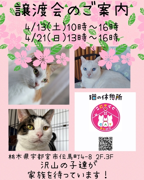 | イベント内容 | 沢山の猫ちゃんが暮らすシェルターにて、譲渡会を行います。 ★譲渡には条件があります。 ★譲渡費用は、猫ちゃんによって変わります。 ★高齢者様でも安心してお迎え出来るシステムがあります。 ★お申し込みの際、アンケートのご記入をお願いしております。 ☆4/13(土)は、オリオンスクエアで「宇都宮猫集会」という猫イベントがあります。こにゃくとは、グッズ販売を行います。譲渡会場ではグッズ販売しないので、合わせてご来場下さい。 |
