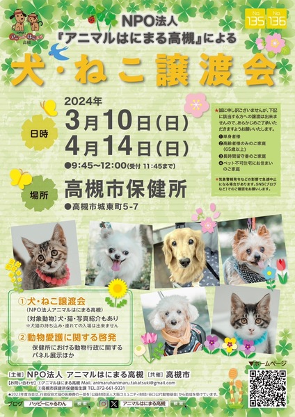 | イベント内容 | 高槻市保健所でほぼ月に1回 譲渡会を開催しています エントリー犬・猫 犬さん チワワコットン・トイプーれん・ヨーキーポアロ・ポメりぼん ねこさんは くり・メッシー・キキ・ララ 詳しくは・・ インスタグラム「アニマルはにまる高槻」 X(旧ツイッター)「アニマルはにまる高槻」 HP「アニマルはにまる高槻」 ブログ「ハッピーにゃるわん」 をご覧ください<(_ _)> 皆でドキドキワクワクお待ちしています! |