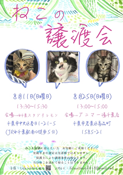 | イベント内容 | 個人ボラさんが愛情をかけて保護している大きな猫ちゃんや小さな猫ちゃんたちが ずっとのお家を求めて集まります。 ねこを家族に迎えたいとお考えの方 会場はアットホームな雰囲気ですので どうぞお気軽にご来場くださいね。 *里親さまの選定は先着順ではありません。 *保護主により譲渡条件は異なります。 *当日ねこちゃんを連れて帰ることは出来ません。 後日 保護主が里親様宅へお届けいたします。 *里親様に医療費のご負担をお願いしております。 第17回 Life With Cat『ねこの譲渡会』 8月11日(日曜日) 13:30~15:30 <会場> レンタルスタジオレモン 260-0033 千葉市中央区春日1丁目21-5 (JR西千葉駅/京成西登戸駅より徒歩4分) *駐車場のご用意はございません。 スタジオより徒歩1分圏内にコインパーキングが多数ありますので そちらをご利用ください。 ブログ→https://ameblo.jp/lifewithcat2018/ Facebook→https://www.facebook.com/lifewithcat2018/ メールでのお問い合わせ→lifewithcat2018@gmail.com |