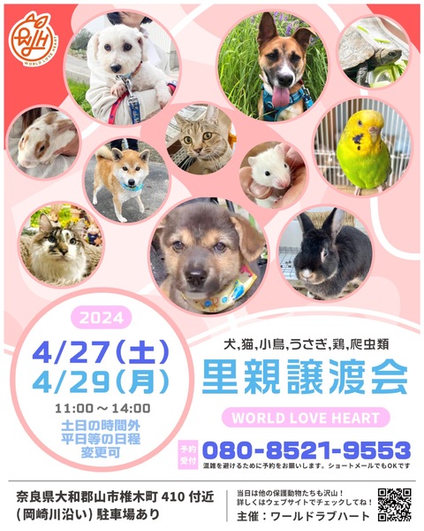 | イベント内容 | ワールドラブハートで里親募集中の動物たちの譲渡会を開催します! 犬猫だけではなく、インコやラット、ウサギにモルモットなどたくさんの保護動物がいます! みんな新しい家族を探しています。写真だけでは伝えきれない魅力が盛りだくさん! 実際に会ってそのかわいさを実感してください♪ ★里親募集中の動物たち★ https://satoya-boshu.net/foster/?@button_name@=search&FosterParent_MemberID=1161 ・犬、猫 ・ハムスター←現在、子ハムスターがたくさんいます! ・ウサギ←12羽います! ・インコ ・キンカチョウ ・ウコッケイ ・ヘビ ・カメ ……など 子犬や子猫もたくさんいますよ♡ ぜひお気軽にお越しください! ●混雑をさけるために、事前予約をお願いします。 予約番号080-8521-9553 ショートメールでも可♪ ●当日までに譲渡が決定した・体調がすぐれないなど、やむを得ない理由で不参加の場合があります。ご希望の子がいましたら、当日お問い合わせください。 ●当日、その場での引き渡しはしておりません。譲渡決定後、自宅訪問を兼ねてこちらからお届け致します。 ご来場お待ちしております♪ ★world love heart(ワールドラブハート)は、奈良県大和郡山市で活動している動物保護団体です。 『引き取り依頼は断らない』をモットーに、犬、猫、鶏、小動物、家畜、爬虫類など捨てられた動物を保護しています。 https://worldloveheart-nara.jimdofree.com |