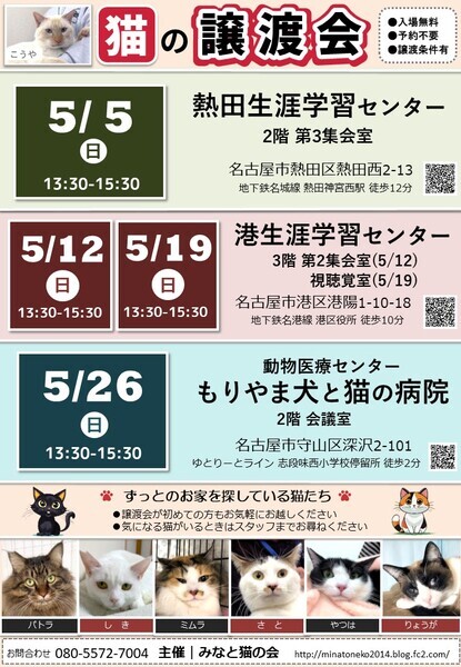| イベント内容 | ネコじゃらし片手に、笑顔あふれる毎日を! ◆ペットショップへ行く前に譲渡会へ◆ 様々な種類の猫とふれあいなあがら 相性を見極めることができます 元里親でもあるスタッフから リアルな体験談を聞くこともできます♪ ・駐車場16台+30台有(利用料300円) ・予約不要&入場無料 ●参加猫一覧 http://minatoneko2014.blog.fc2.com/blog-entry-1778.html ●参加猫は ・子猫も成猫も全頭ワクチン接種済 ・ノミダニ駆除済 ・トイレ躾済 ・ケージレストのトレーニング済 ●参加する猫たちについて 基本治療やトイレのしつけは済んでいます 足りないのは共に生きる新しい家族だけです 「譲渡会は行ったことがなくて不安…」 「猫を飼うのははじめて」 「今すぐじゃないけどいずれ猫と暮らしたい」 そんな皆様も大歓迎! ●譲渡に関して ※完全室内飼い・誓約書・治療費負担等の 諸条件があります。 ※譲渡やトライアルに関する契約条件は 猫の保護主によって異なります。 ●譲渡会その他についての問い合わせは みなと猫の会 minatonekonokai@gmail.comもしくは 080-5572-7004 までお願いします。 ♪参加する猫ちょこっと紹介 写真2枚目 ミムラねーさん ♀ 2~3才 外猫時代の怪我のせいで 後ろ左足一部を失いましたが 生活に支障はありません 毎日元気に走り回っています♪ 譲渡の流れなど詳しくは下記ブログをご覧ください。 ◎主催者ブログ みなと猫の会 ~こぴっと猫だより~ http://minatoneko2014.blog.fc2.com/ |