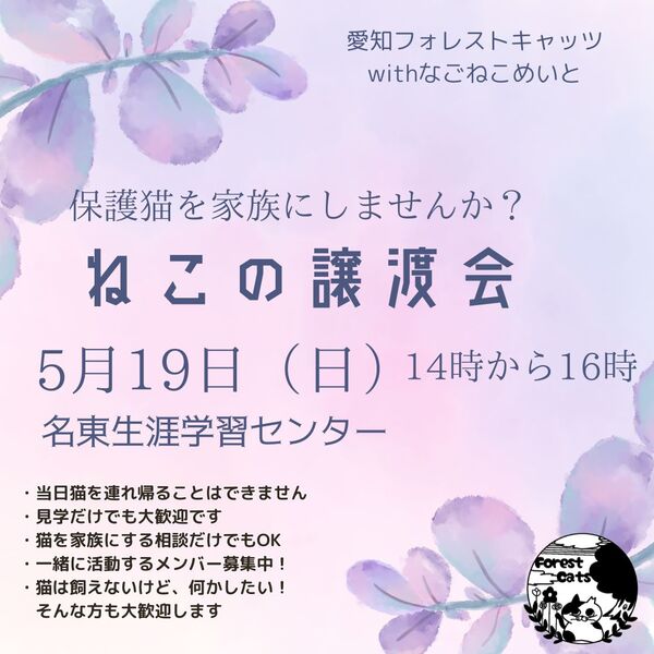| イベント内容 | 日時 5月19日(日) 14時〜16時 場所 名東生涯学習センター 名古屋市名東区社が丘3-802 主催 愛知フォレストキャッツwithなごねこめいと 地域猫活動やTNR活動の過程などで 保護した猫たち 子猫もいれば、大人猫もいます 見学、相談だけでも大丈夫! 予約不要、参加費無料なのでお気軽に 猫に関する活動を何かしたい、という方も歓迎です 遊びに来る感覚で、お越しくださいませ ☆猫に関して☆ 各団体の保護主さんごとに決めているお約束事があります ・当日は猫を連れ帰ることはできません ・猫を迎えるにあたり、飼育環境などについて お話しをさせていただきトライアル(お試し飼育) から始めさせていただきます ・2週間前後のトライアル期間を経て、問題ない ようであれば、譲渡契約書を結び正式譲渡と なります ・所定の譲渡費用をいただきます |