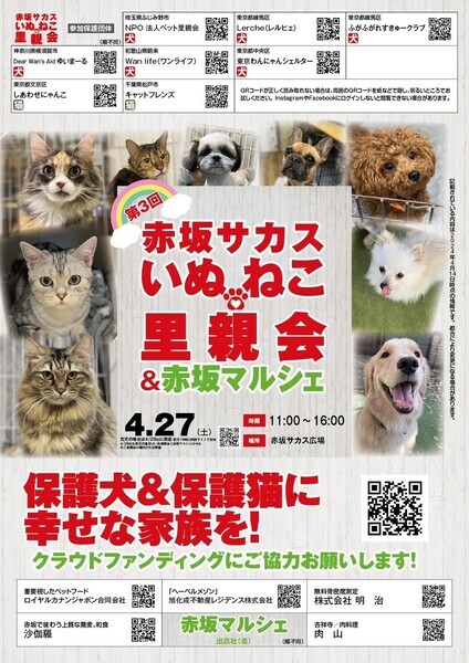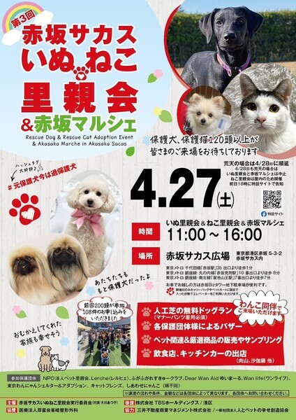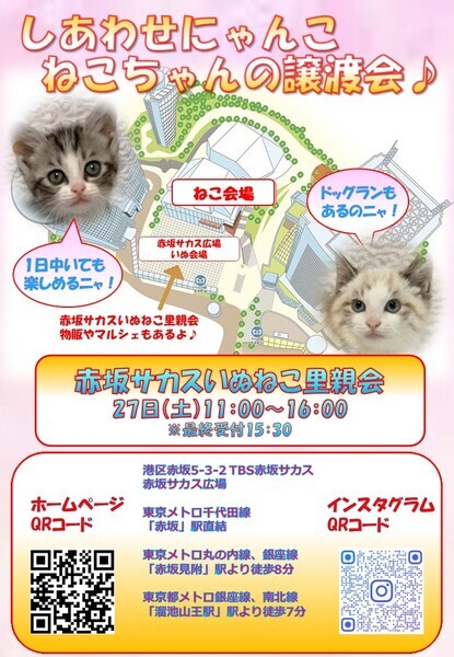 | イベント内容 | 「しあわせにゃんこ」は行き場のない猫ちゃんと里親様との 出逢いの場を提供するグループです♪ 子猫も成猫もハンデのある猫もみんな新しい家族を待っています♪ みなさまのご来場を保護主、スタッフ一同心よりお待ちしております♪ 再びしあわせにゃんこが赤坂サカスに上陸します! なんと赤坂サカスいぬねこ里親会に参加決定! 赤坂サカス広場にはワンコのドッグランもあって同伴もOK♪ にゃんこ会場はTBS様のご厚意で室内開催です♪ ◆開催日/開催時間◆ 2024年4月27日(土) 11:00~16:00(最終受付15時30分) ※当日、猫ちゃんを連れて帰ることは出来ません。 後日調整のうえ保護主が里親様宅へお届けいたします。 ◆会場◆ 入場無料です! 譲渡会場:東京都港区赤坂5丁目3-2 赤坂サカス広場 ※詳しいアクセスはホームページをご覧下さい https://www.tbs.co.jp/sacas/ ◆交通手段◆ 東京メトロ千代田線「赤坂」駅直結 東京メトロ丸の内線、銀座線「赤坂見附」駅より徒歩8分 東京都メトロ銀座線、南北線「溜池山王」駅より徒歩7分 ※お車でご来場の際、駐車場のご用意はございません。 赤坂サカス駐車場もしくは近隣のパーキング等をご利用ください。 いつ里の掲載参加猫一覧はこちらから https://satoya-boshu.net/mypage/foster_list.php?@ps@=none アメーバブログの里親募集にゃんこはこちら https://ameblo.jp/shiawasenyan-ko/theme-10092719565.html ◆猫ちゃんとのお見合い◆ 掲載している猫ちゃんは基本的に譲渡会場でのお見合いのみとなります。 譲渡会への参加が決定している猫ちゃんはその譲渡会で里親様が決定しなかった場合のみ 保護主宅でのお見合いが可能となります。 自宅お見合いを希望される里親様はメール(info@shiawasenyanko.net)にてご相談ください。 ◆当譲渡会では猫ちゃんと里親様のスキンシップを大切にしています◆ 新しい家族として20年以上いっしょに暮らしていく猫ちゃんです。 譲渡会場でたくさんの猫ちゃんと触れ合って良きパートナーを見つけてください。 はじめて猫ちゃんを迎える不安や先住猫ちゃんとのトライアルの注意点、 猫ちゃんと里親様の暮らし方など気軽にご相談ください。 経験豊富な保護主や猫大好きスタッフがアドバイスさせていただきます。 ◆子猫ご希望の里親様◆ 子猫は急な下痢や発熱等により体調が急変し、数時間対応ができなかっただけでも命を落とす事があります。 その為、当譲渡会では月齢によりお留守番のない又は少ないご家庭への譲渡に限らせて頂いております。 また里親様と子猫ちゃんが安心してトライアル期間を過ごせるよう体重が1㎏程になってからのお届けとさせて頂いております。 ◆里親希望のみなさまへ◆ ご家族の皆様で生涯、家族の一員としてたっぷり愛情を注いでくださるご家庭をお待ちしております。 下記に該当する希望者様へ ・独身、単身者の方 ・友人同士、同棲でのお住まいの方 ・高齢者のみのご家庭の方 は、ご相談の上、譲渡を判断させて頂きます ・適正飼育の不可能な方 ・脱走防止対策を考えて頂けない方 ・定期報告の不可能な方 は、ご遠慮下さいますようお願い致します ◆ご負担頂く費用について◆ 譲渡の際に譲渡負担金(医療費の一部、譲渡金、お届け時の交通費)を里親様にご負担頂く事により 過酷な状況にいる猫ちゃんを保護し新しいご家族の元へ送り出す事ができています。 皆様のご理解とご協力にボランティア一同、心より感謝しております。 ご負担頂く医療費につきましてはホームページに詳しく記載させて頂いております。 http://www.shiawasenyanko.net/onegai.html しあわせにゃんこホームページ http://www.shiawasenyanko.net メールでのお問い合わせ info@shiawasenyanko.net |