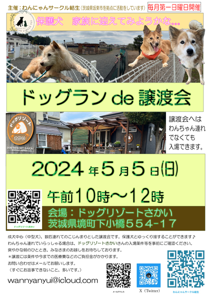 | イベント内容 | 譲渡対象地域は関東及び福島県です。 午前中の開催ですので、午後からの譲渡会へのハシゴも可能です。 ☆ 雨でも開催いたします!! ☆ 雨の場合、雨を愛でながら「クラブハウスで雨宿り譲渡会」となります♪ ☆ いつもは元気な保護わんたちが一変し、静かな甘えん坊姿が見れるいい機会です。 ☆ (完全室内飼いも悪くないかも♪と思うこと必至) ☆ ですが譲渡を押しつけませんからご安心を。 ☆ 保護活動のことなどおしゃべりにも花が咲くかも♪ ☆ ぜひお越しください♪ ☆ ☆ ¨ ¨ ¨ ¨ ¨ ¨ ☆ |!|!|!|!|! ☆ !|!__⊥__!| ☆ |!///∧\\\! ☆ !|⌒⌒⌒T⌒⌒⌒| ☆ |! ∧_∧ | !|! ☆ (´・ω・〇 ☆ ──|∪ /J──── ☆ ::∪`∪: :::::::: ドッグランを会場にしますが、ドッグランエリア外の クラブハウステラスで保護犬たちと一緒にくつろいでお待ちしております。 ですので人間だけでいらっしゃっても大丈夫。 わんちゃん連れでももちろんお気軽にお越しいただけます。 会場は圏央道「境古河インター」から車で約5分くらいです。 住所は、茨城県猿島郡境町下小橋554‐17ですが ナビでは「茨城県猿島郡境町下小橋554‐2」のほうがわかりやすいかも知れません。 住宅地にあり、民家の間を入ると駐車場があり、ドッグランが広がります。 わんちゃんたちがどのくらい早く走るのか、最高でどのくらい引っ張られるのか ドッグランの中で遊ばせてみるとわかると思います。 (おうちの中ではこんなに走り回りませんからご安心を) ネットからの申し込みも可能です。 【私たちの譲渡会への想い】 いくら大切に愛情こめて世話をしていても、大勢保護していますので その子だけに愛情を注ぐことはできませんし、遊ぶ時間も限られます。 一日でも早く家族をつくってあげたい。 家族に愛されて幸せになってほしい、 どなたか家族として迎えに来てもらえたら。 祈りを込めて開催しています。 会場ではいつもスタッフみんな、ほんわかムードです。 (押し付け、強制、強い自己主張はしませんのでご安心ください。) あまりスタッフの人数がいないので、お話するのにお待ちいただくこともあります。 今回迎え入れるお気持ちがある方はできればご家族全員でお越し下さい。 今は里親になれない方でも、どうぞお気軽にいらしてください。 このこたちにとっては、いろいろな人間に会うことも勉強です。 【急な中止・中断・来場制限などについて】 (会場運営に基づく制限による変更・中止に従いますのでどうぞご了承ください) 台風などの悪天候に基づく変更や中止などありましたら 当日6時までにペットのおうちやSNSでお知らせします。 【わんちゃんを連れて譲渡会にいらっしゃる方へ 】 ドッグランで一緒に遊ぶ場合はドッグランへの入場料などが必要です。 入場する際は利用条件もございますので 次のホームページから必ずご確認ください。 ↓ドッグリゾートさかいホームページ https://www.dogresort-sakai.com/ なお、譲渡会を目的に、わんちゃん連れで譲渡会にいらっしゃった方には、次回の利用から使える入場料割引券をお渡ししています。 (割引券は次回の譲渡会でなくても、一般の利用の割引券としても使えます。が譲渡会でお渡しした方とそのご家族限定のものになります。) 【インスタグラムライブ配信のご案内】 ぜひライブ配信もご覧ください。(保存するので後からも見られます) インスタグラム「わんにゃんサークル結生]のアカウントで開催時間内にライブ配信を予定しいます。 *ライブ配信時間は前後することもあります。 (事前にインスタグラムをフォローしていただくことをおすすめします。) ライブ配信は、保存しますので、後程みていただくこともできます。 お申込み先等はライブ配信の最後のあたりでご案内できると思います。 https://www.instagram.com/wan_nyan_yui/ 【今回の譲渡会での参加わんちゃん】 クラブハウスのテラスで行いますので、会場の狭さから 参加わんちゃんは2~3ひきに制限しています。 実際にいらっしゃったご家族の連れたわんちゃんともふれあうこともできます。 保護わん保護猫は大勢いますが 人馴れなどの状態で、おすすめトップクラスの子達を連れて行きます。 今回以外の保護わんちゃん、保護猫さんに関心のある方は、 おはなしあいの上、後日個別にお見合いすることもできます。 いいご縁があるよう祈りを込めて配信します。 参加予定のわんちゃんが決まり次第 写真を更新します。 参加候補のわんちゃんは大体が中型犬です。 (時々小型犬も参加します) 全員避妊去勢手術済み。 混合ワクチン接種済み。 狂犬病予防接種済み。 フィラリアは大体陰性ですが、陽性のこもいます。 (薬は予防的に感染の恐れのある期間は毎月飲ませています。) マイクロチップ装着済み。 ノミダニ駆虫薬は予防的に毎月処方。 直近の便検査でも異常ありません。 とても素直で人馴れしています。 本気噛みしません。 お散歩はまだ引っ張ることが多いです。 ぜひドッグランで一緒に遊んでみて