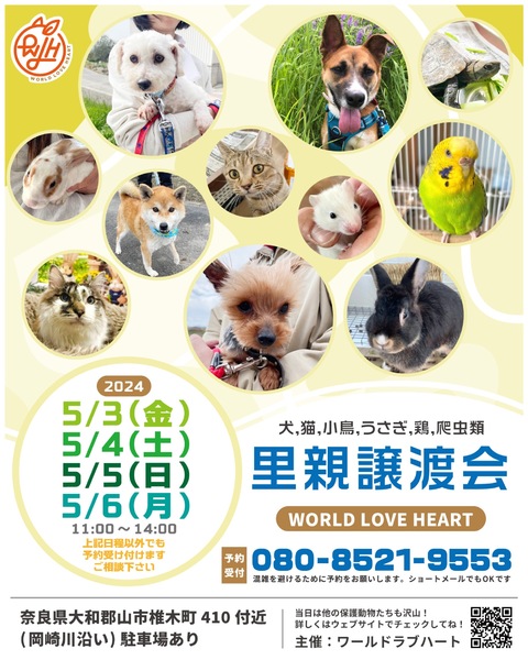 | イベント内容 | ワールドラブハートで里親募集中の動物たちの譲渡会を開催します! 犬猫だけではなく、インコやラット、ウサギにモルモットなどたくさんの保護動物がいます! みんな新しい家族を探しています。写真だけでは伝えきれない魅力が盛りだくさん! 実際に会ってそのかわいさを実感してください♪ ★里親募集中の動物たち★ https://satoya-boshu.net/foster/?@button_name@=search&FosterParent_MemberID=1161 ・犬、猫 ・ハムスター←現在、子ハムスターがたくさんいます! ・ウサギ←12羽います! ・インコ ・キンカチョウ ・ウコッケイ ・ヘビ ・カメ ……など 子犬や子猫もたくさんいますよ♡ ぜひお気軽にお越しください! ●混雑をさけるために、事前予約をお願いします。 予約番号080-8521-9553 ショートメールでも可♪ ●当日までに譲渡が決定した・体調がすぐれないなど、やむを得ない理由で不参加の場合があります。ご希望の子がいましたら、当日お問い合わせください。 ●当日、その場での引き渡しはしておりません。譲渡決定後、自宅訪問を兼ねてこちらからお届け致します。 ご来場お待ちしております♪ ★world love heart(ワールドラブハート)は、奈良県大和郡山市で活動している動物保護団体です。 『引き取り依頼は断らない』をモットーに、犬、猫、鶏、小動物、家畜、爬虫類など捨てられた動物を保護しています。 https://worldloveheart-nara.jimdofree.com |