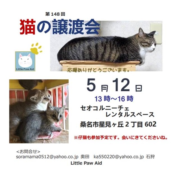 | イベント内容 | 日時 5月12日(日) 13時~16時 場所 セオコルニーチェレンタルスペース 三重県桑名市星見ヶ丘2丁目602 子猫5匹参加します 成猫のノルウェージャンも参加予定です みんな個性的で可愛い子たちです 抱っこも出来ます 猫を飼いたいと思っている方も猫を見てみたいと思っている方もお気軽に遊びに来て下さい それぞれの保護主により譲渡条件があります 当日猫を連れ帰る事はできません。 参加猫は保護主のブログで確認ください ほんわか猫な日々 https://blog.goo.ne.jp/soramama はるごまいけのブログ http://ameblo.jp/harugoma3futagozaru/ 予約は不要です 連絡先 soramama0512@ezweb.ne.jp |